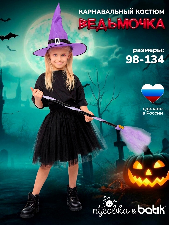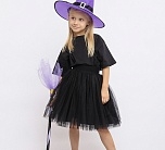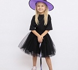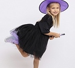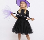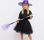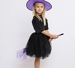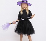 Карнавальный костюм Ведьмочка (эконом) детский. Комплект костюма состоит из черной пышной юбочки на резинке, сиреневой шляпы и метлы. Такой образ подойдет для детской тематической вечеринки или Хэллоуина.