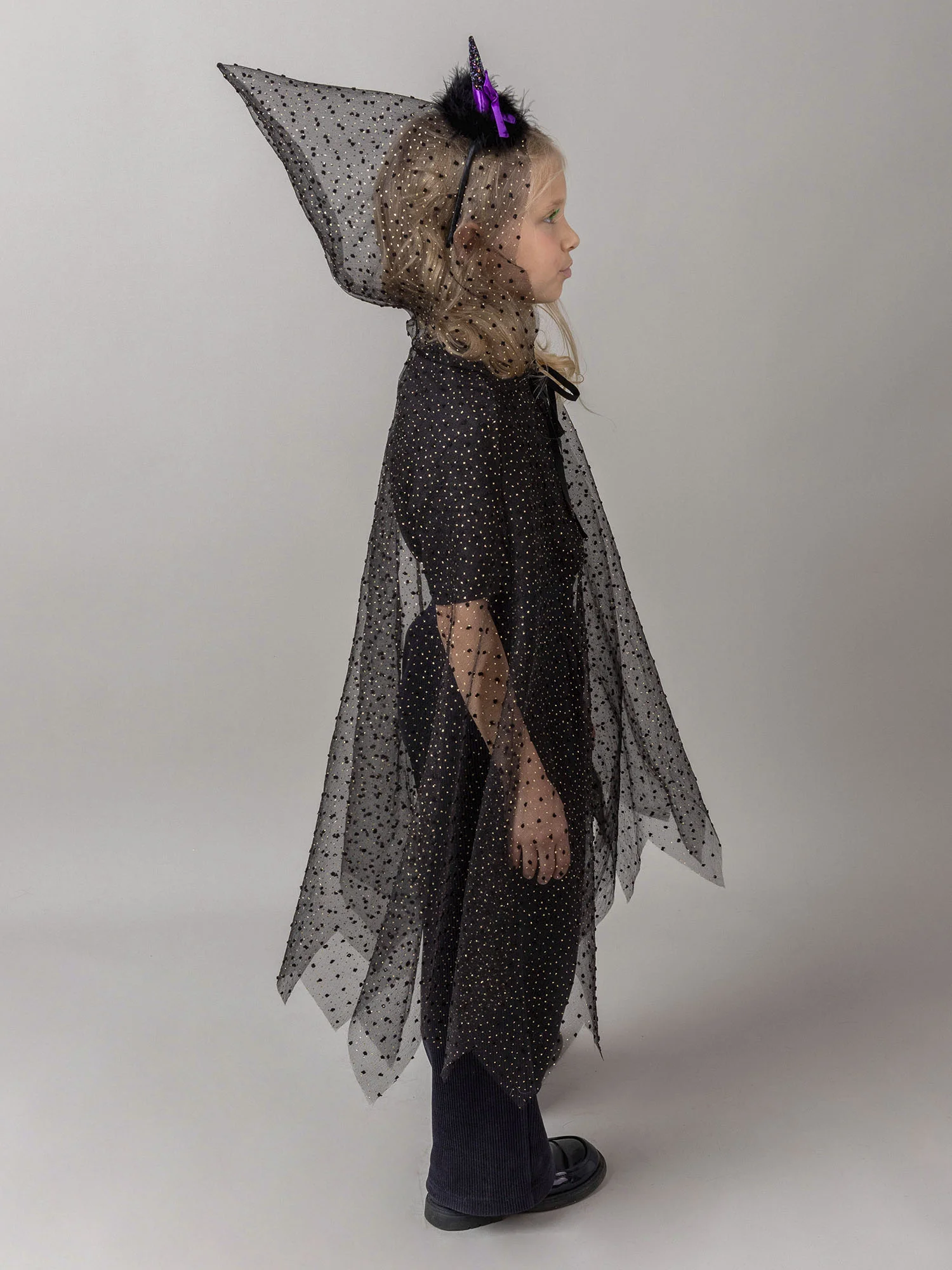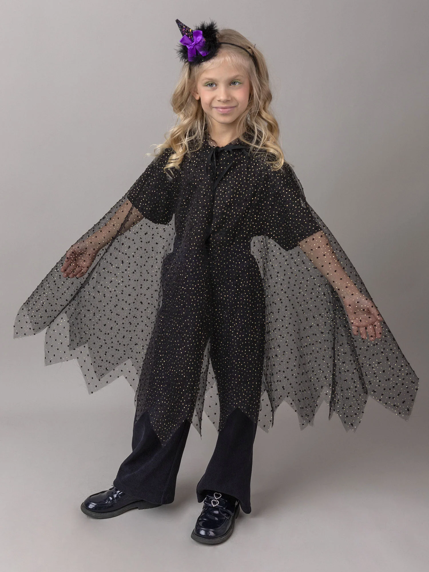 Карнавальный костюм Ведьмочка — идеальный выбор для Хеллоуина! Яркое платье с пышной юбкой, волшебной шляпкой и атмосферными деталями создаст загадочный и сказочный образ маленькой колдуньи.