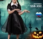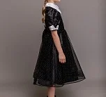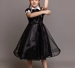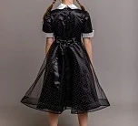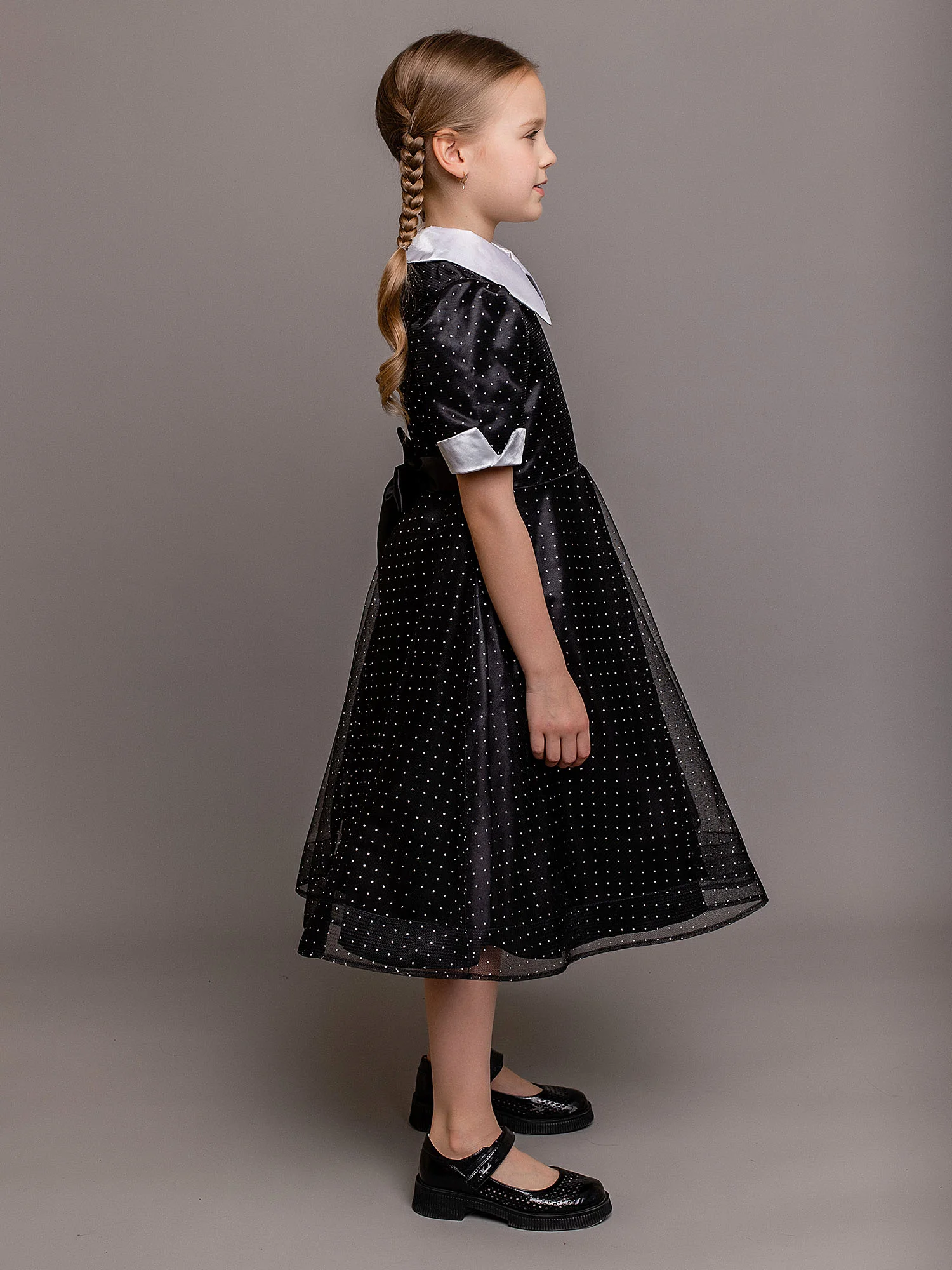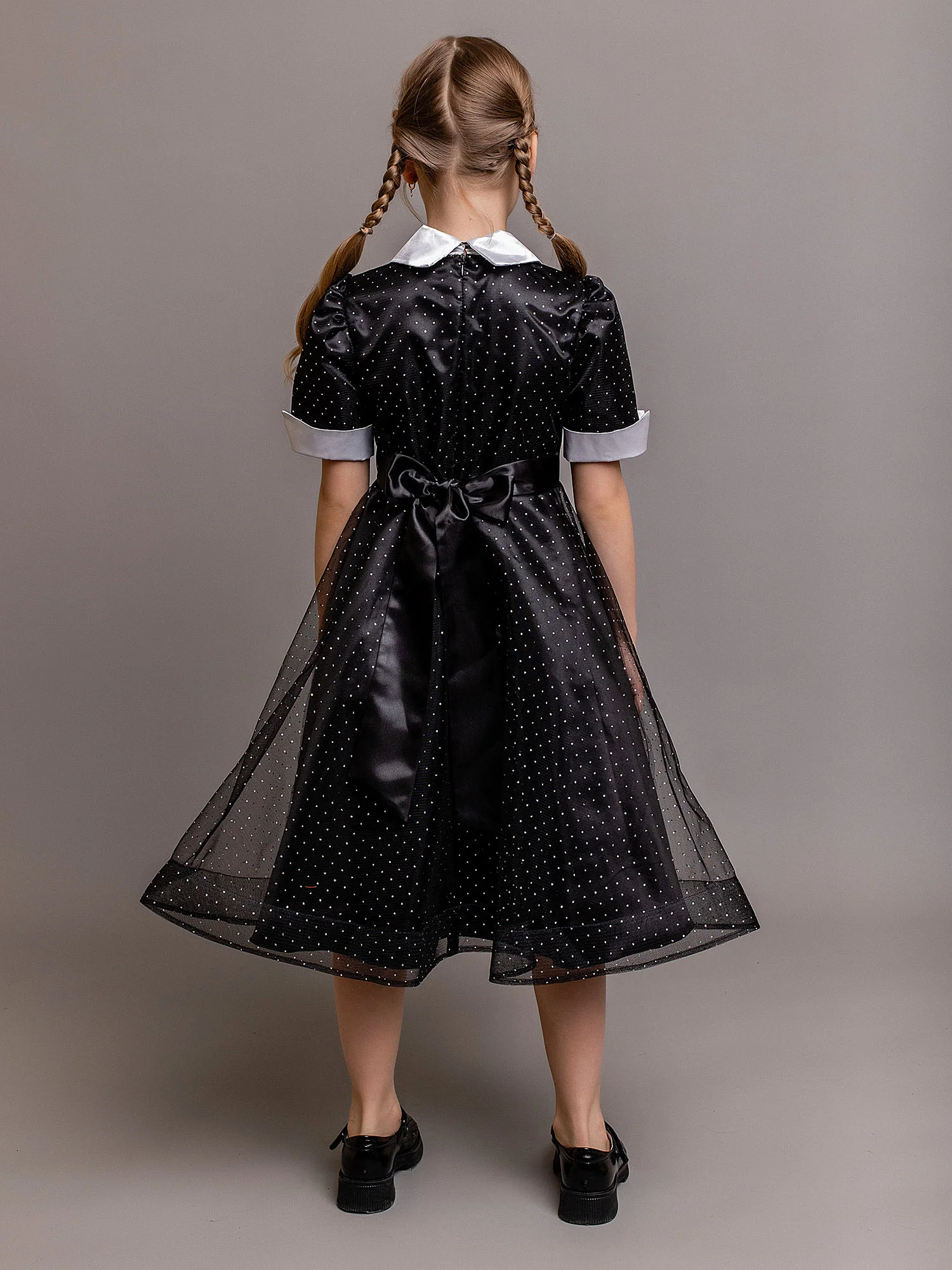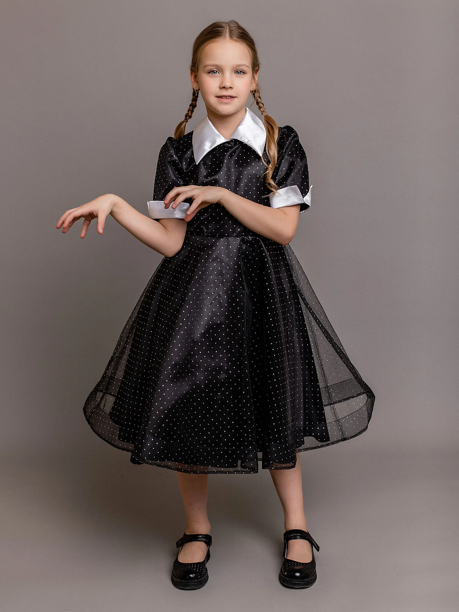 Нарядное платье из сериала Wednesday - настоящий хит для девочек от 6 до 10 лет. Модное платье Уэнсдей станет великолепным нарядом на выпускной, Хэллоуин, тематическую фотосессию или день Рождения. Платье черного цвета с мелкий горошек с коротким рукавом. Имеет белый отложной воротник, верхняя часть из сетчатой черной ткани.