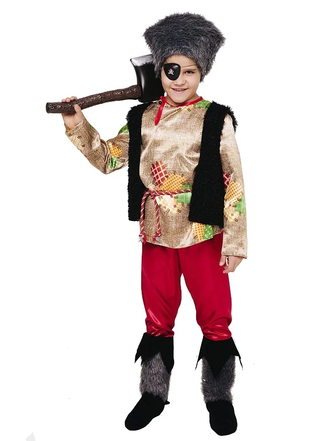 Карнавальный костюм Разбойник подойдет всем мальчикам, которые хотят примерить на себя новое интересное амплуа и удивить всех на празднике. А еще это отличный костюм для спектакля. В таком костюме разрешается пошалить, но только совсем немного! В комплект костюма Разбойник входит: рубаха, жилетка, брюки с сапогами, шапка, повязка на глаз.