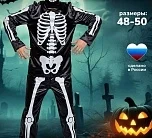 Карнавальный костюм Скелета для взрослых на Хэллоуин. В комплект костюма входят: рубашка, брюки, маска, перчатки. Костюм имеет яркий принт в виде костей скелета. Подойдет для вечеринок и выступлений, поможет создать качественный и жуткий образ к Хэллоуину. Материал - полиэстер и хлопок.