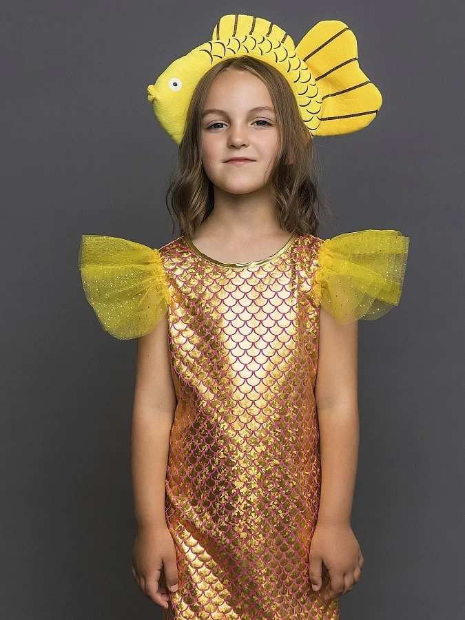 Карнавальный костюм Золотая рыбка для девочки. Комплект костюма состоит из блестящего длинного платья и ободка в виде рыбки. Костюм из золотой ткани с рисунком чешуи и рукавами-крылышками, подол пышный из желтого фатина.
