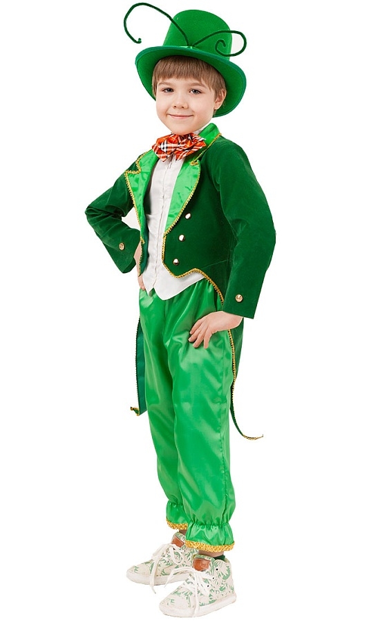 Костюм Кузнечика детский напоминает нам о всеми любимой детской песенке «В траве сидел кузнечик». В костюме очаровательного зеленого Кузнечика мальчик может отправиться на новогоднюю елку или поучаствовать в спектакле. Костюм пошит из зеленого сатина с бархатными вставками. Комплект состоит из фрака, брюк, цилиндра и бабочки.