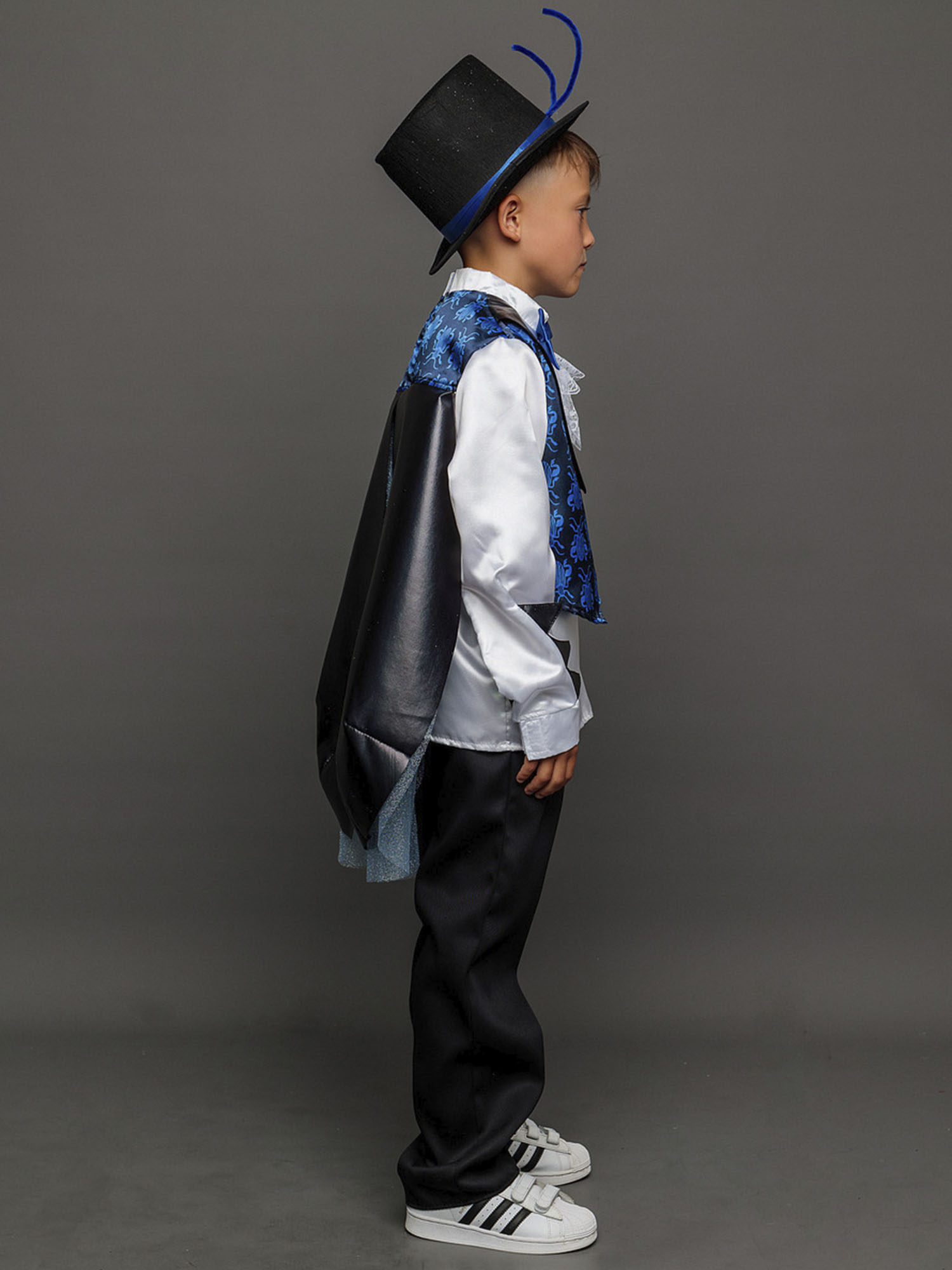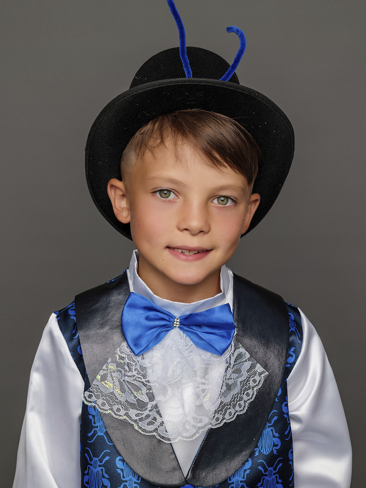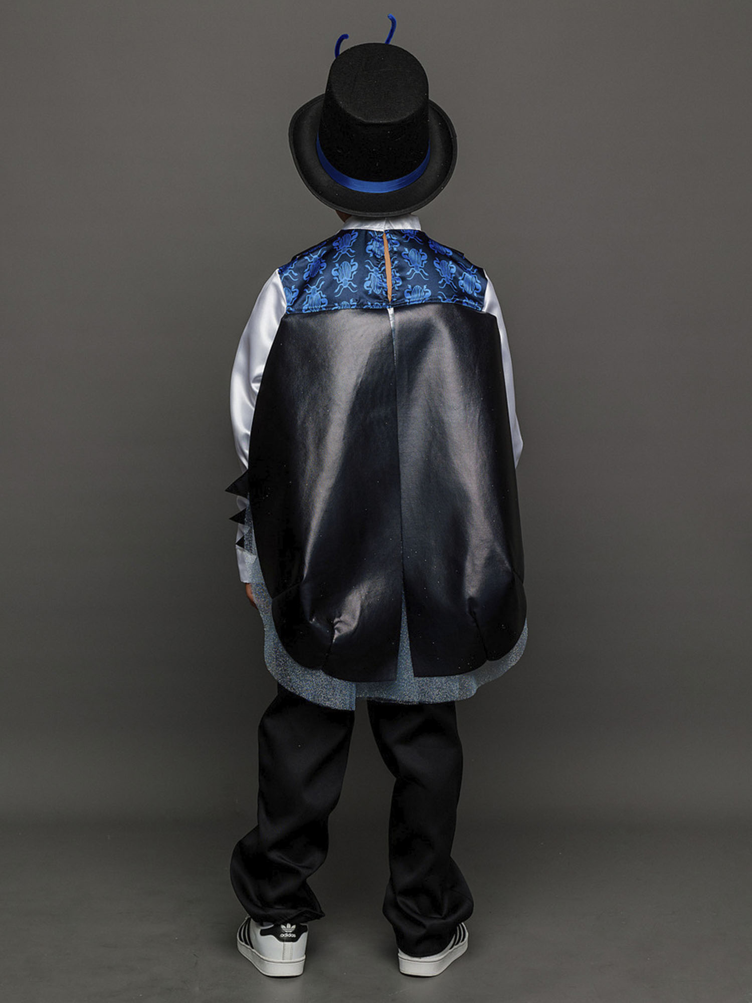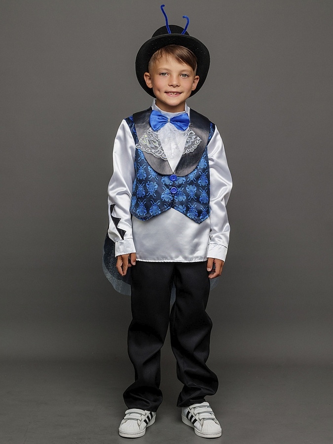 Костюм Жука детский маскарадный для выступлений и новогодних елок. Замечательный сказочный образ синего Жука выделит мальчика на костюмированном празднике. Комплект костюма Жук состоит из рубашки, жилета с крыльями, брюк и цилиндра.