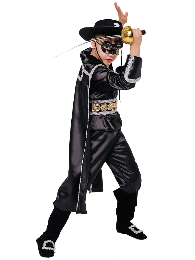 Зорро настолько популярен, что его знают по многочисленным фильмам и мутьтфильмам, а также комиксам. Вариация костюма Зорро от бренда Пуговка – это полностью черный костюм с маской. Наряд отлично подойдет для новогоднего маскарада.