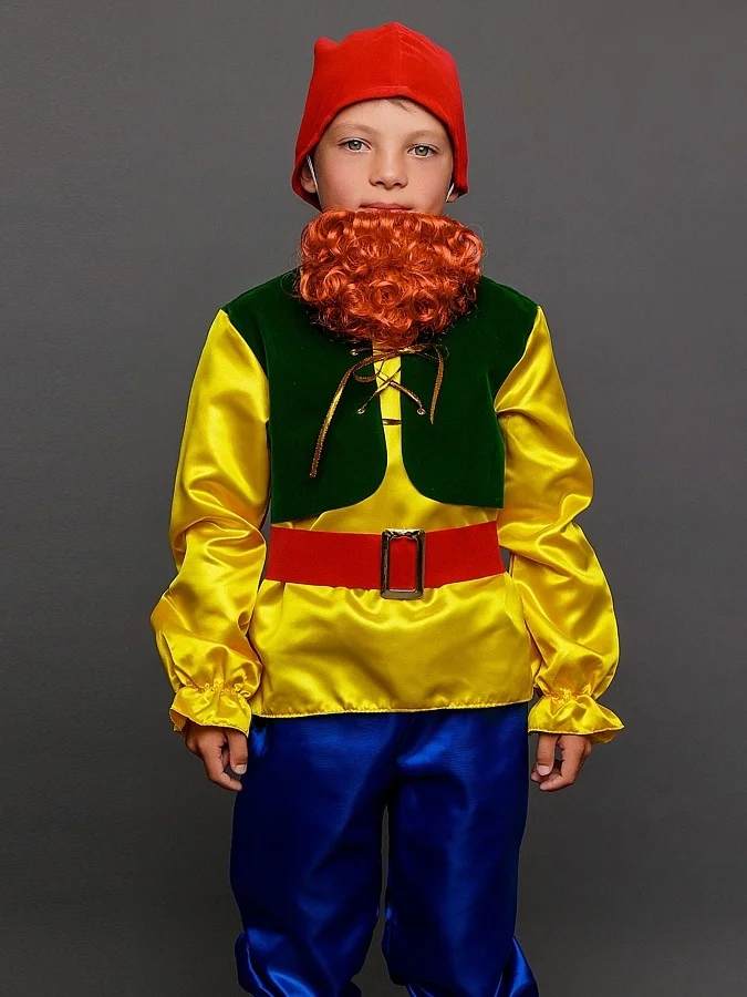 Этого сказочного коротышку знают все, ведь гномов можно встретить и в книгах, и в мультфильмах, и даже в кино. А еще в детских садах и школах этот персонаж зачастую становится главным персонажем детских спектаклей и номеров. Карнавальный костюм Гном Тилли – яркий и забавный образ для мальчиков 4-11 лет. В комплект входит рубашка с поясом, брюки, башмачки, колпак, борода.