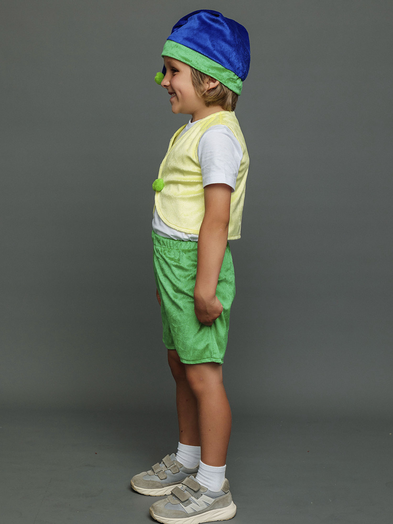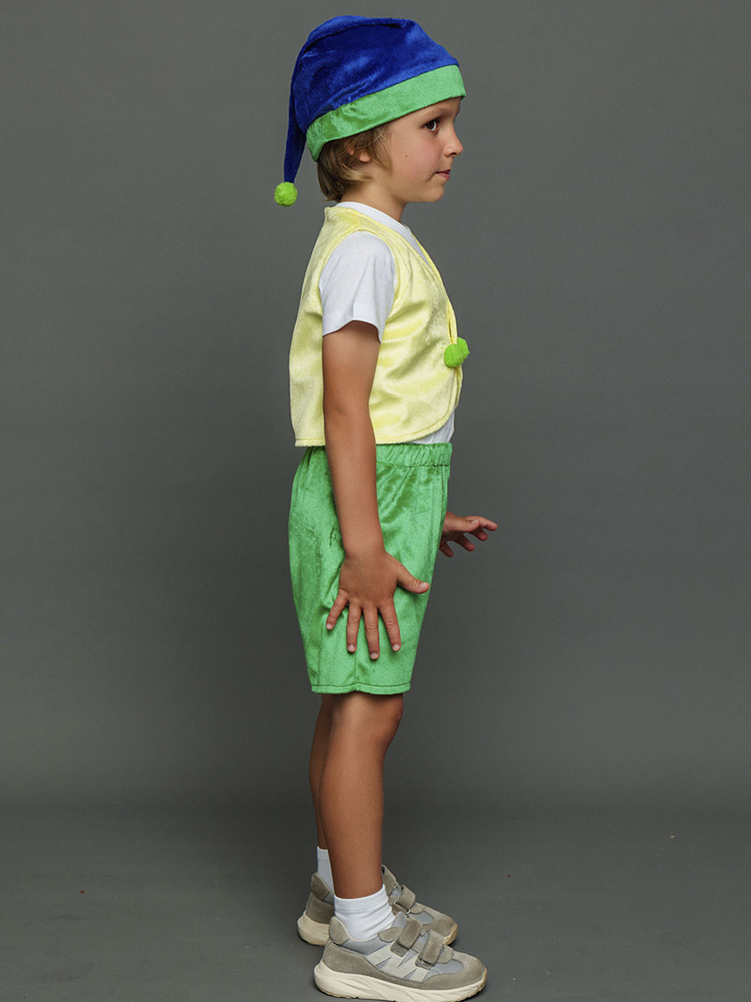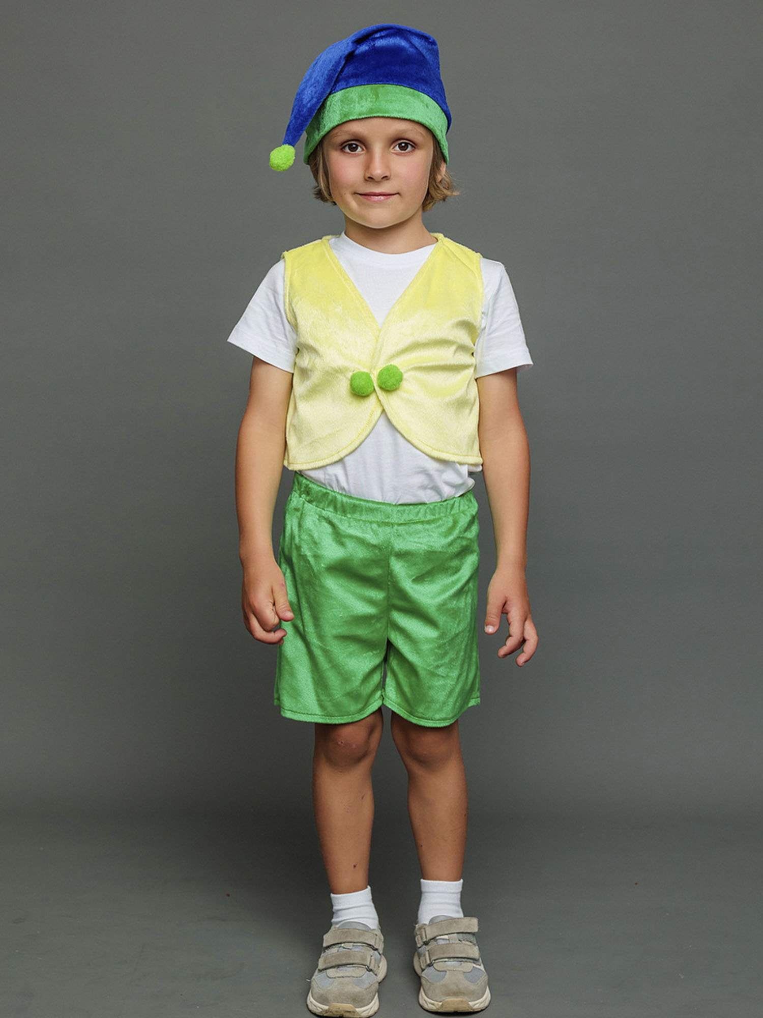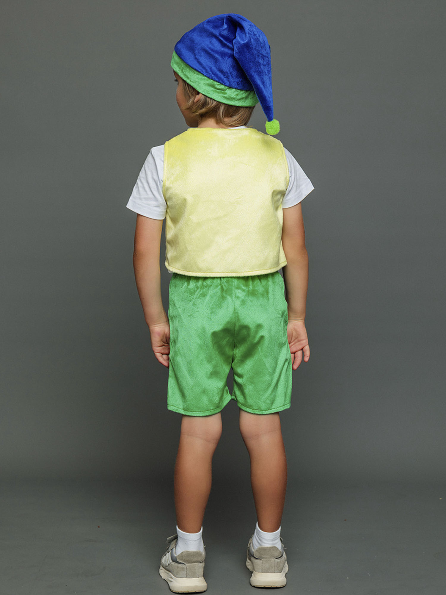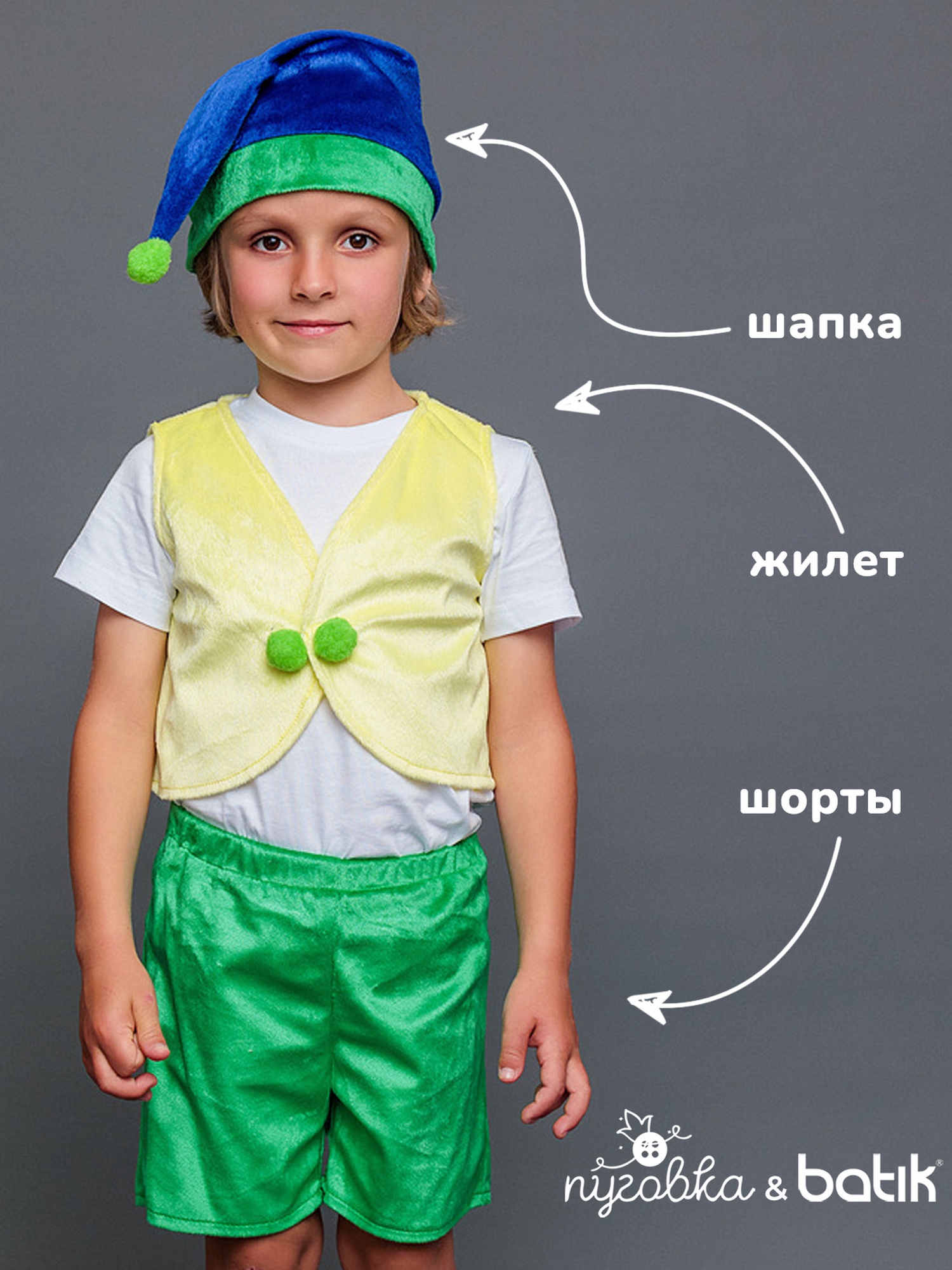 Несложный дизайн, но при этом отличающийся стилем и качеством – в костюме Гном Тоша смело можно отправляться и в гости, и на елку, и на сцену детского театра. Костюм отличается невысокой ценой, но при этом он будет отлично смотреться на мальчике возраста 4-6 лет. В комплекте вы найдете шорты, жилетку и колпак.