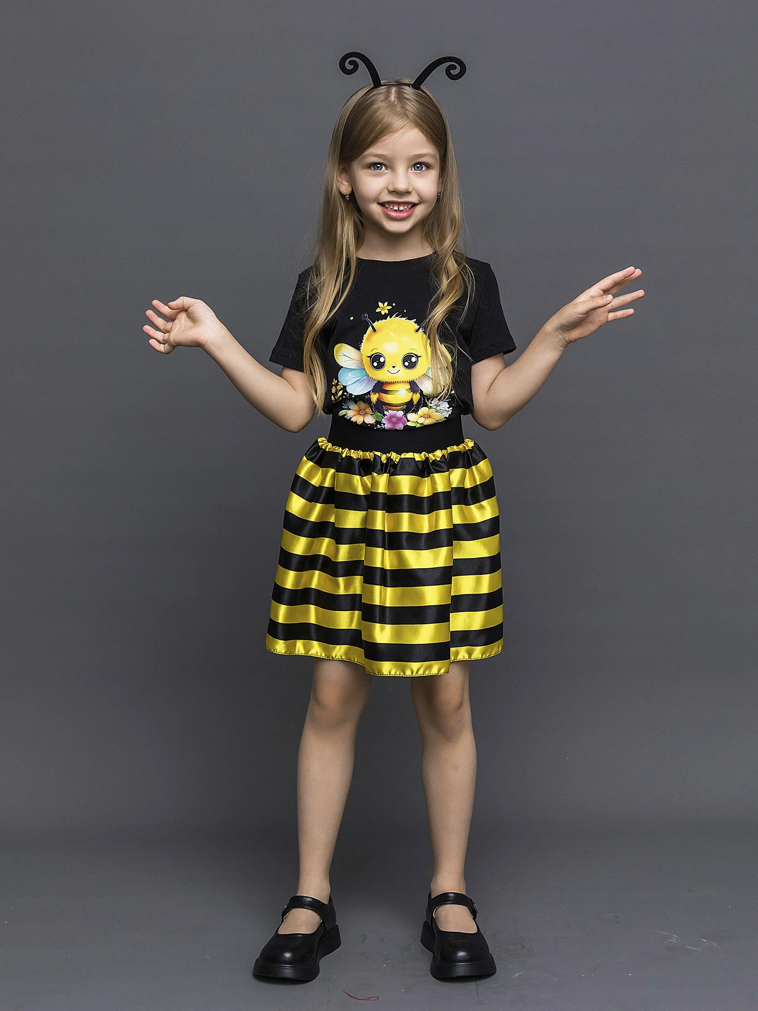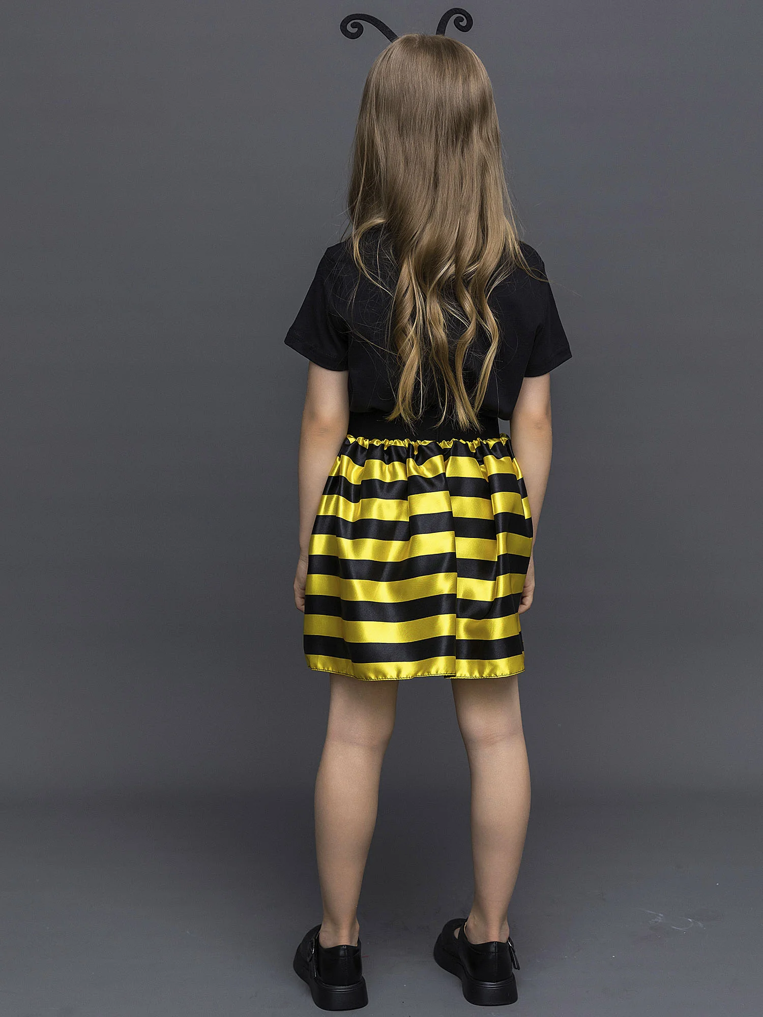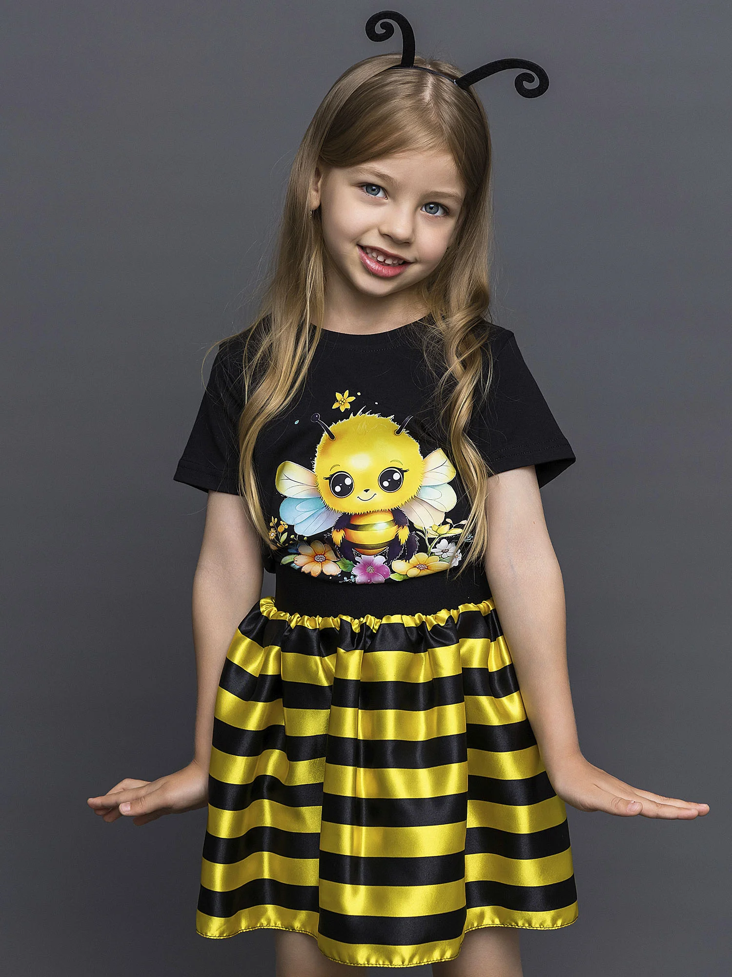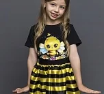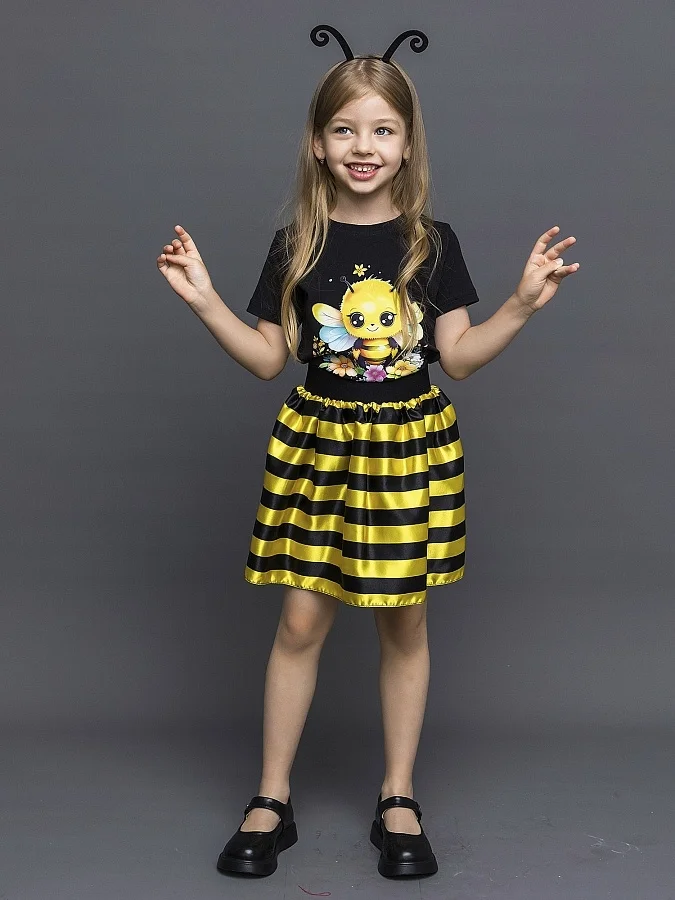 Карнавальный костюм для девочки Пчелка. В комплекте юбка в полоску, футболка с коротким рукавом, ободок с "усиками". Идеальный выбор для создания яркого и незабываемого образа.
