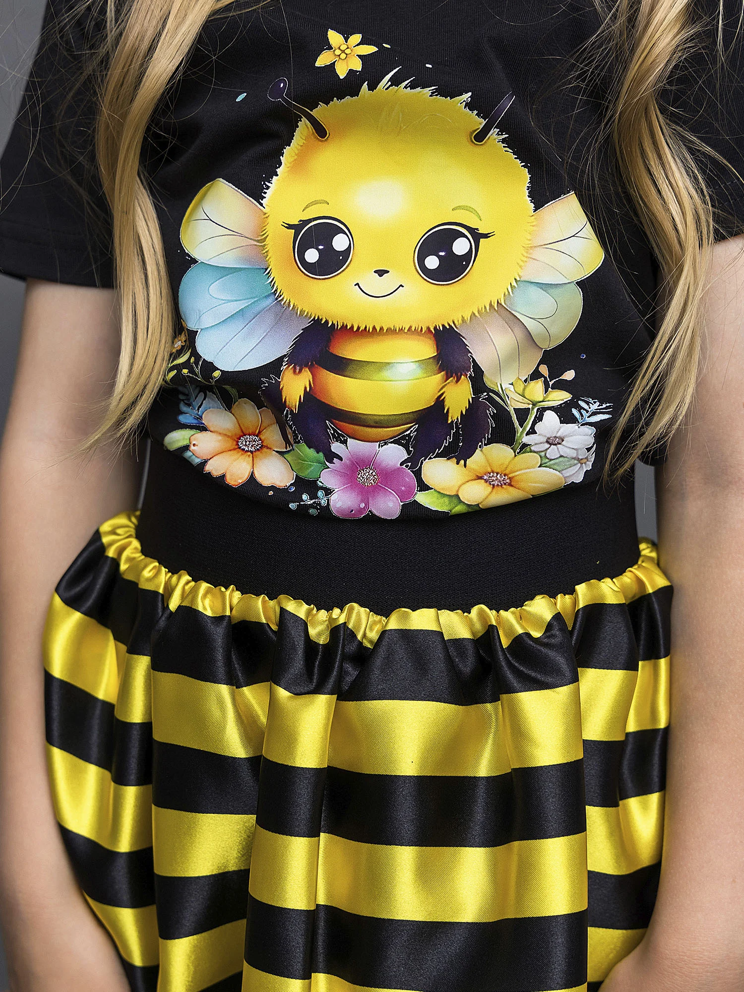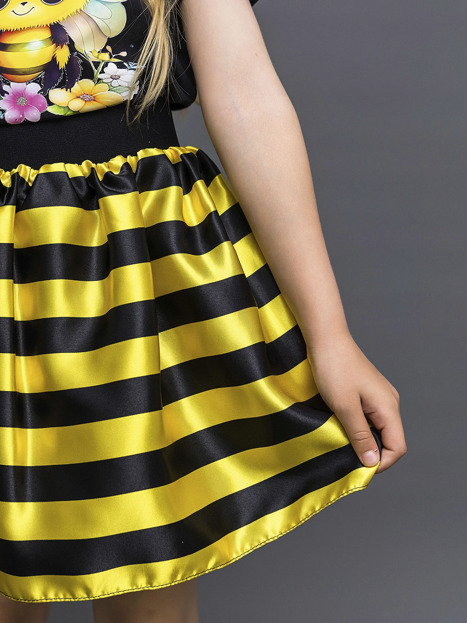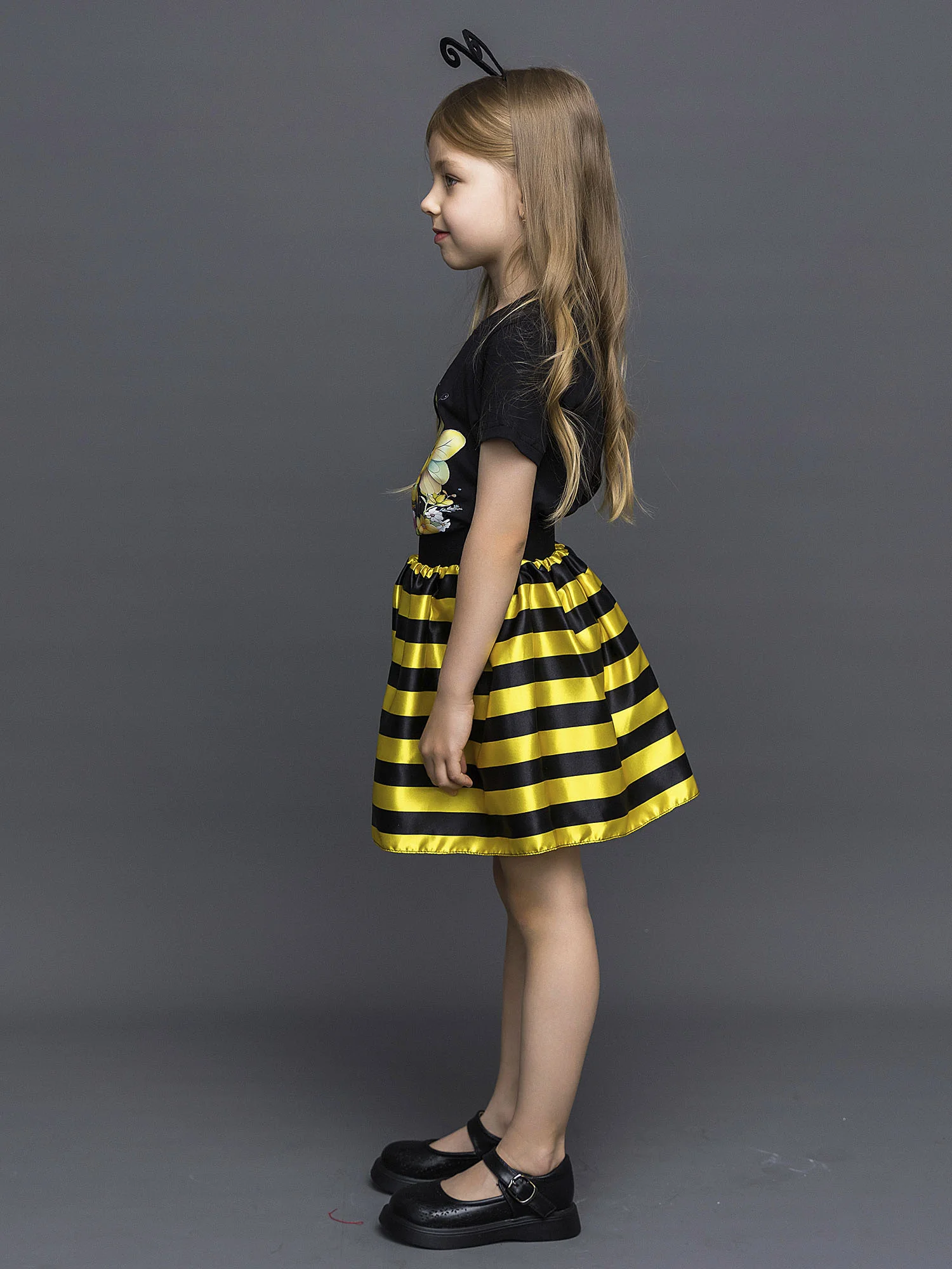 Карнавальный костюм для девочки Пчелка. В комплекте юбка в полоску, футболка с коротким рукавом, ободок с "усиками". Идеальный выбор для создания яркого и незабываемого образа.
