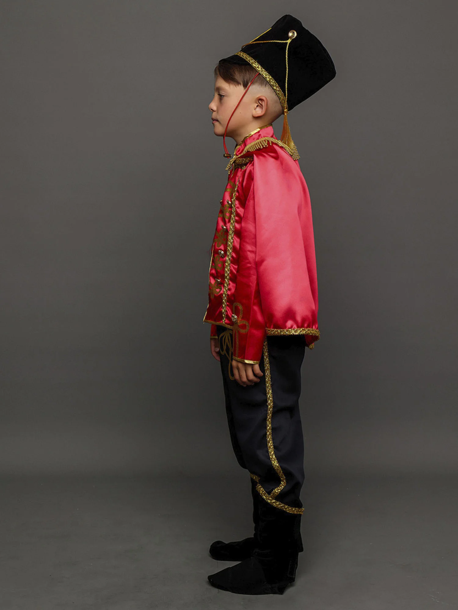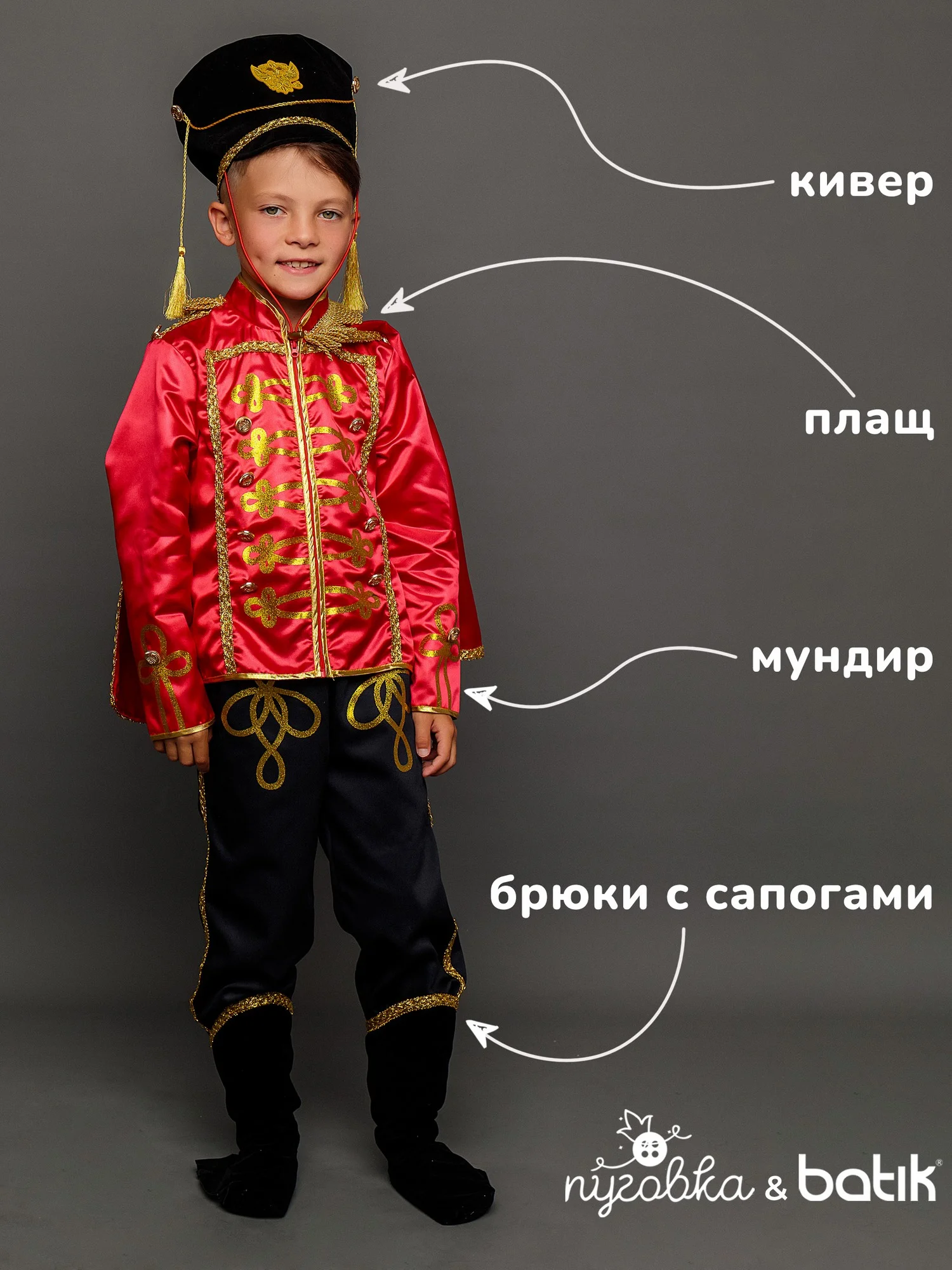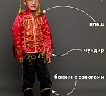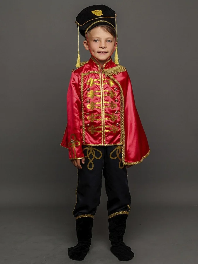 В карнавальном костюме "Гусар" легко почувствовать себя лихим воякой, рвущимся в бой. Такой яркий образ обязательно понравится всем мальчикам. Отлично подойдет для спектаклей, представлений, маскарада или детского утренника. Костюм, состоящий из мундира, кивера, брюк с сапогами и плаща, будет прекрасно смотреться на мальчике любой комплекции.