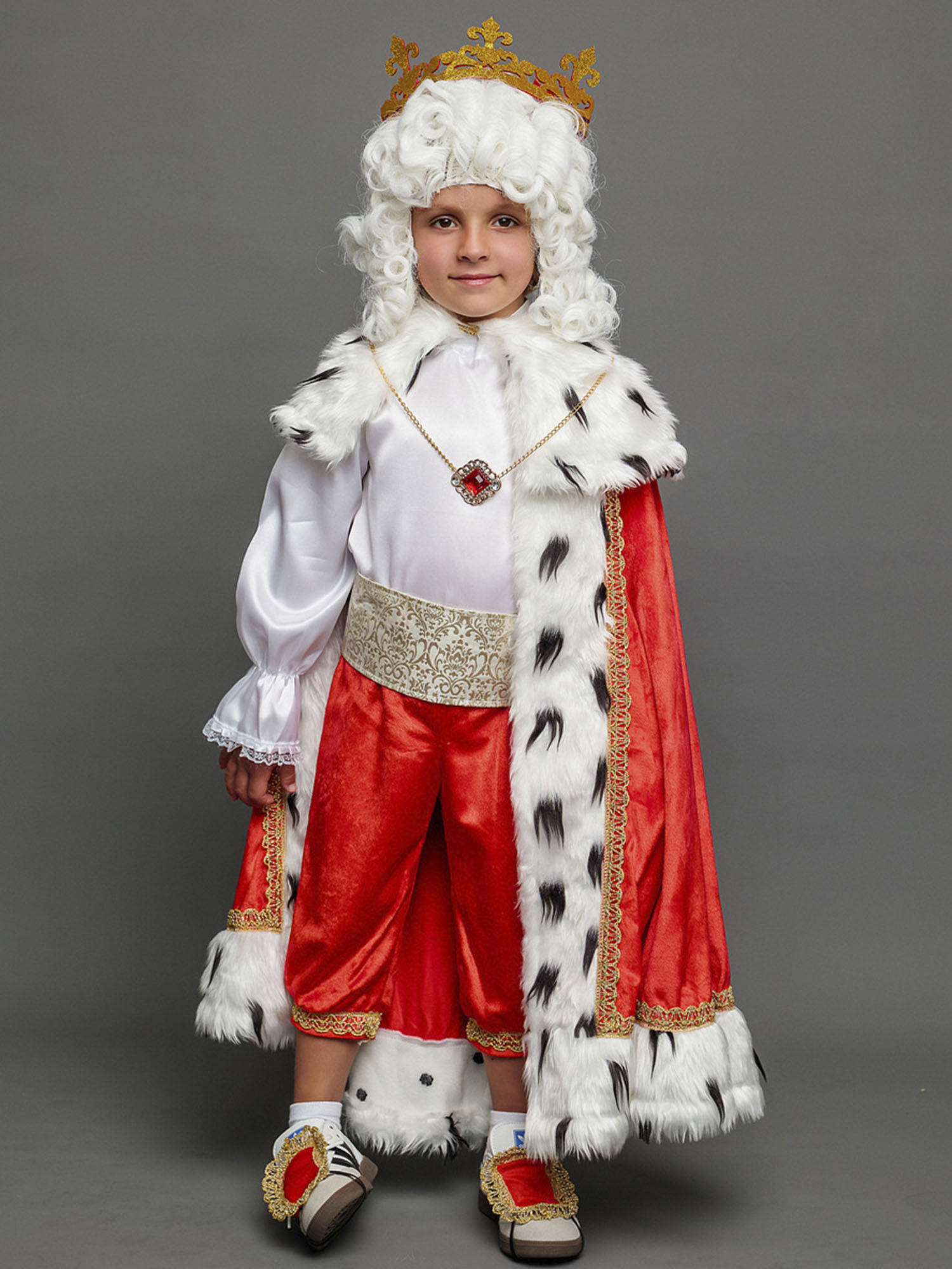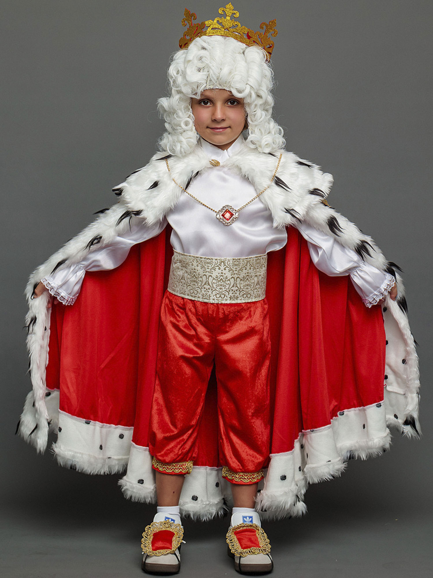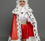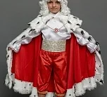 Костюм Короля – шикарный маскарадный образ для мальчиков, который подойдет для спектаклей, новогодних елок и утренников. А еще в этом костюме будет эффектно выглядеть именинник в свой день рождения, особенно если праздник будет проходить в костюмированном стиле. Комплект костюма Короля для мальчика состоит из рубашки, брюк, мантии, пояса, накладок на обувь, подвески, парика и короны.