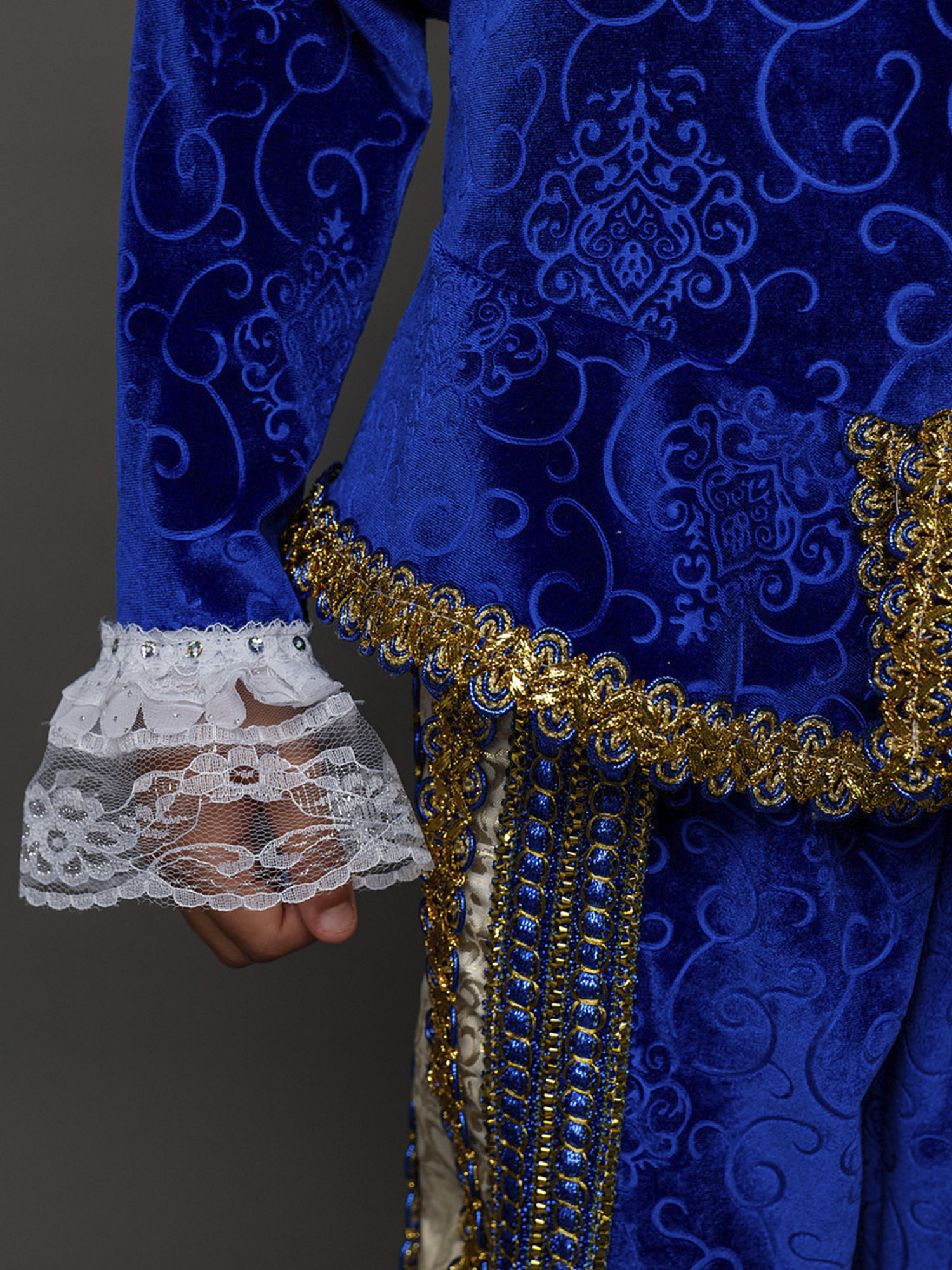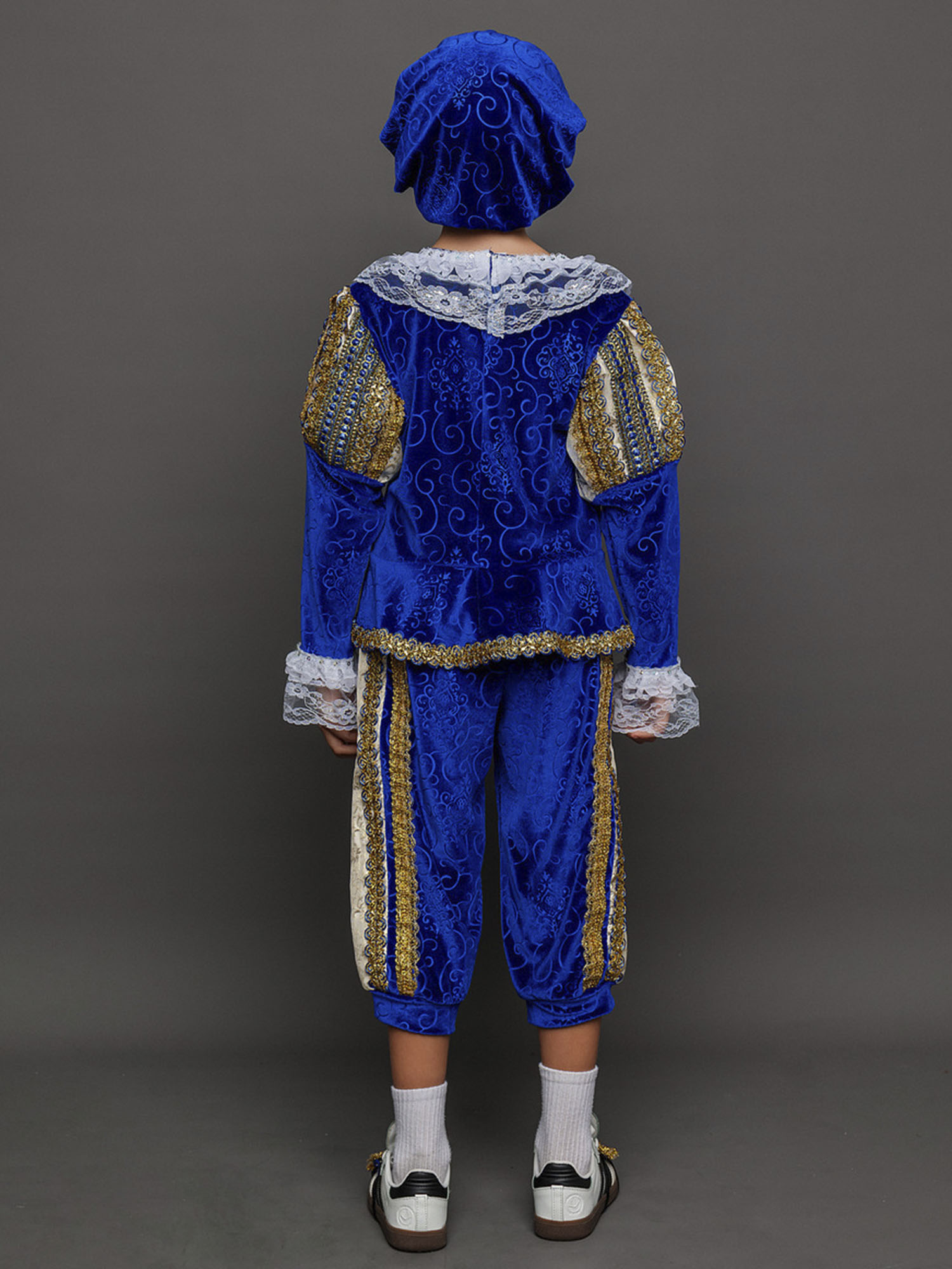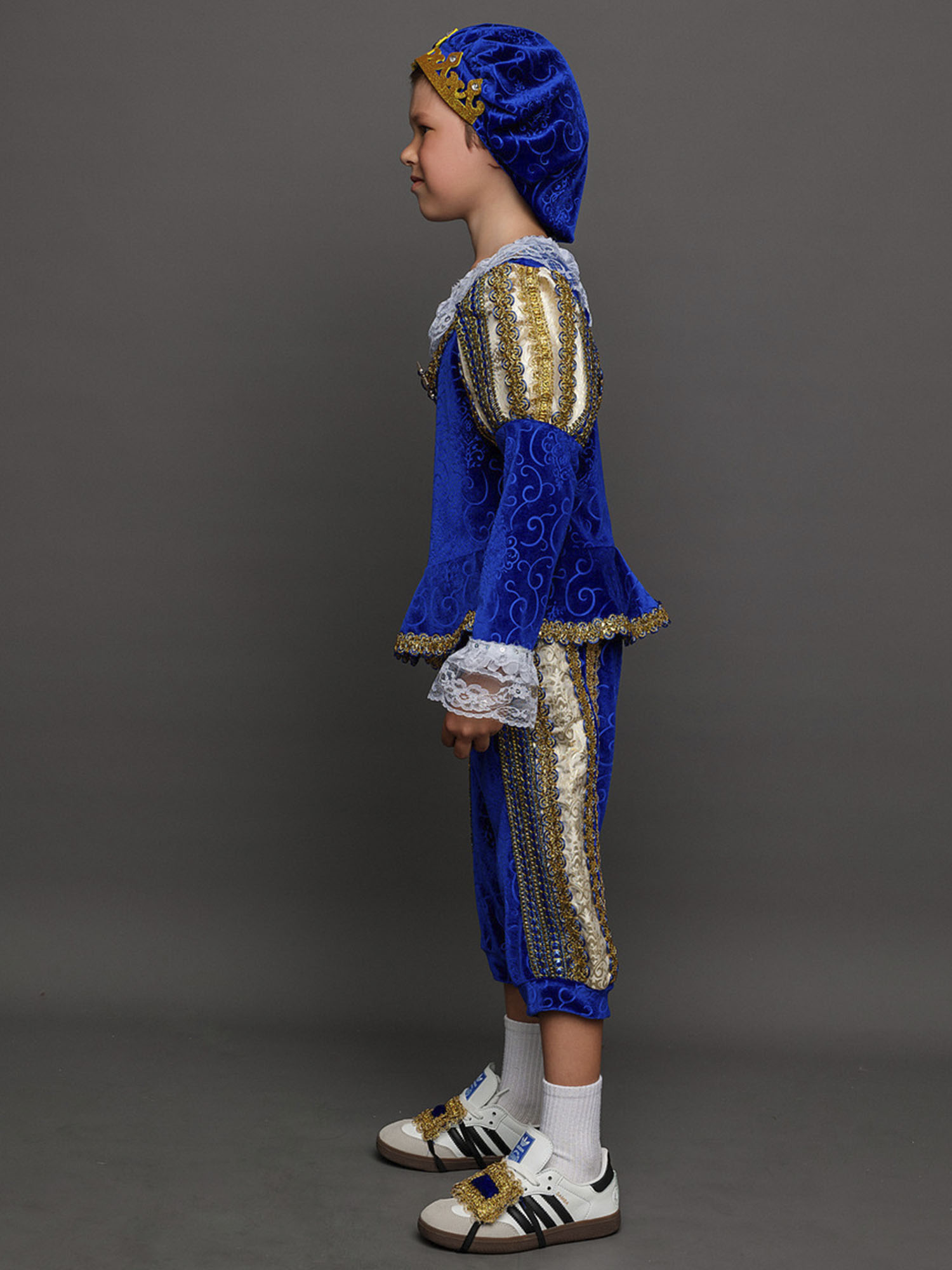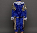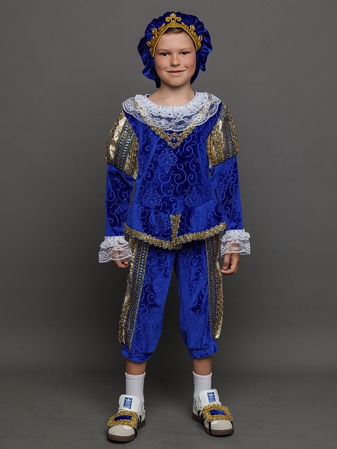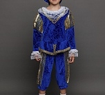 Карнавальный костюм Принц – наряд, который подойдет любому мальчику. По-настоящему аристократичный образ будет прекрасно смотреться на новогодней елке или представлении. Также костюм подходит для спектаклей. Комплект костюма состоит из синего камзола, бриджей, головного убора и накладок на обувь.