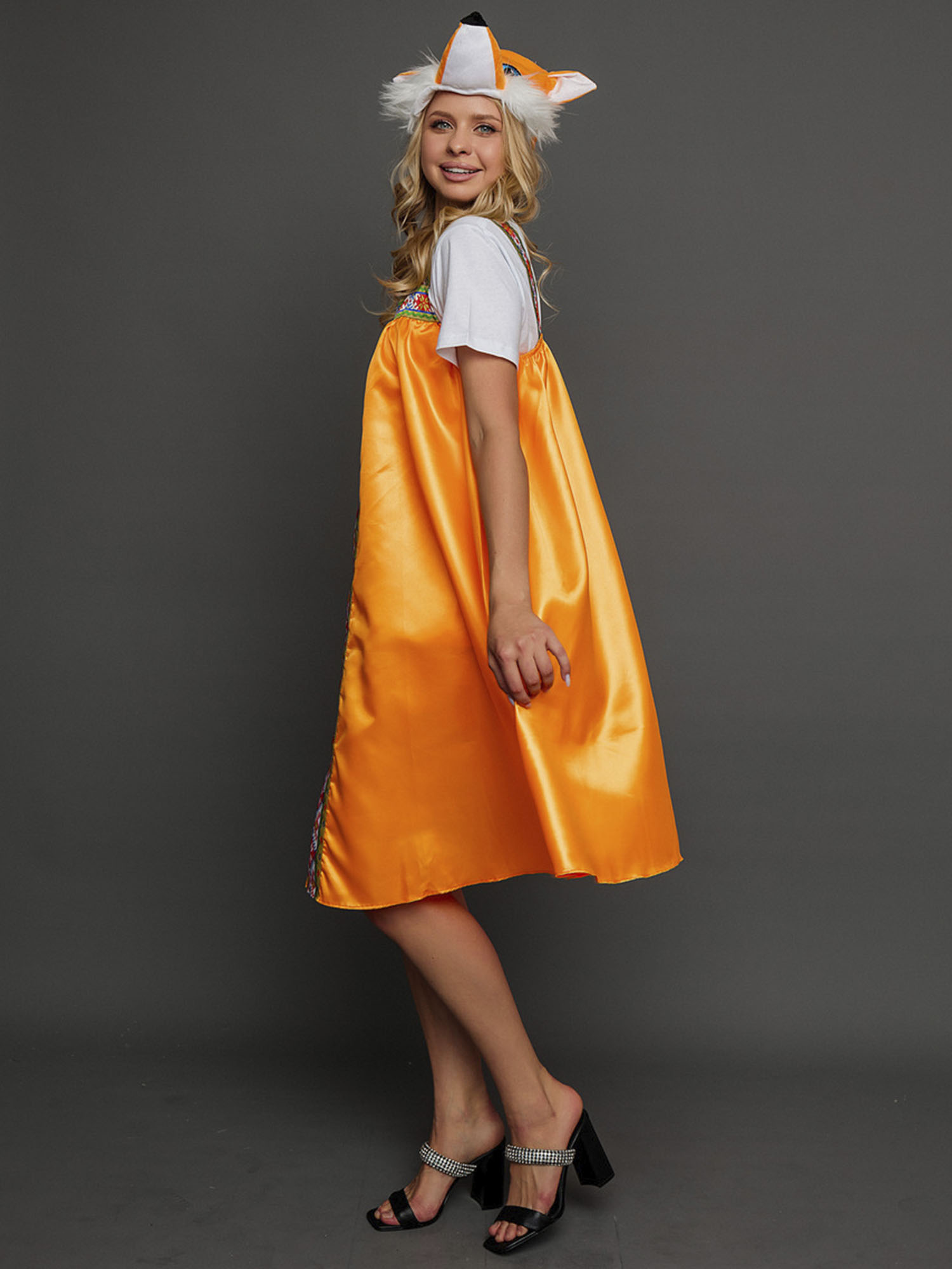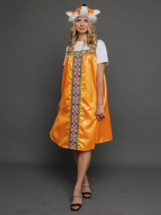 Костюм Лиса Патрикеевна для взрослых способен задать настроение на любом празднике. Спектакль, детский утренник, оригинальный номер на корпоративе или свадьбе – этот наряд везде будет как нельзя кстати. В комплект входит сарафан и шапка-маска.