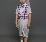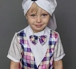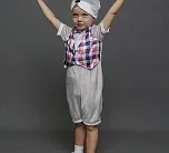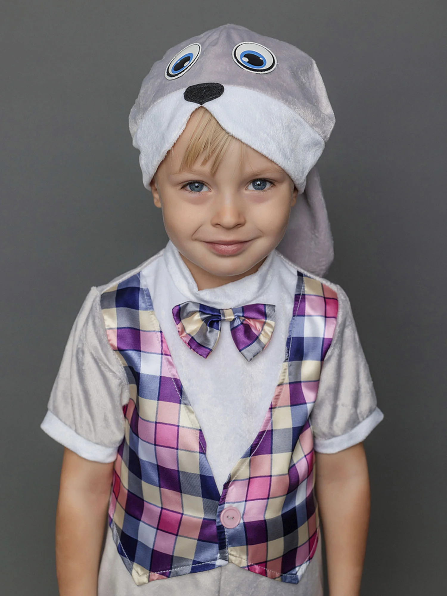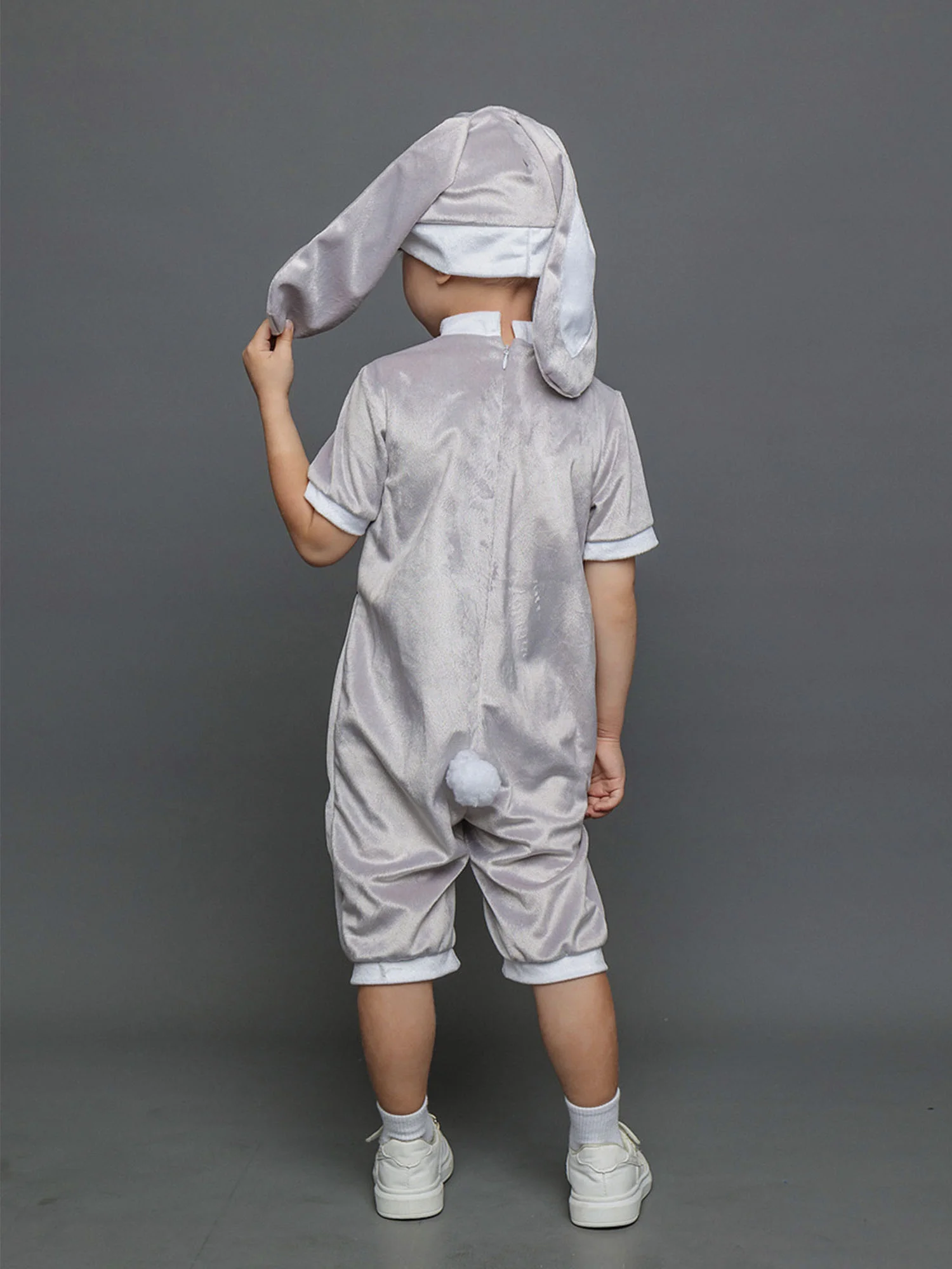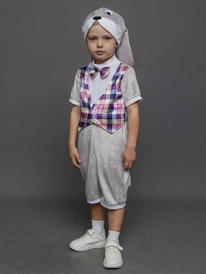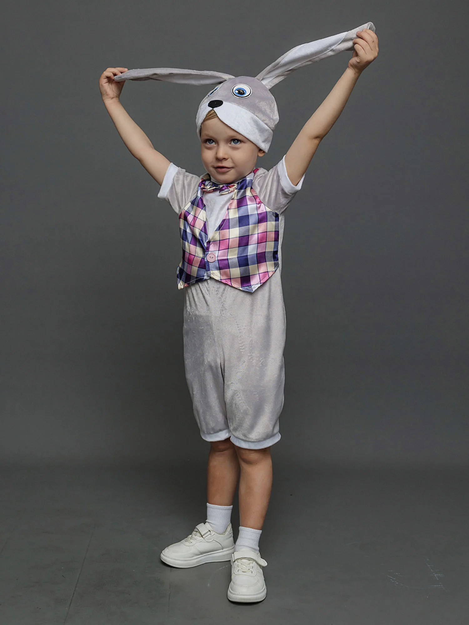 Карнавальный костюм Кролика серого цвета. Комбинезон украшен яркой красочной жилеткой на большой пуговице и в тон бантик на воротнике. Комбинезон застегивается на спинке на молнию. Маска серенького цвета с ушками в тон жилетке.