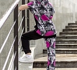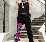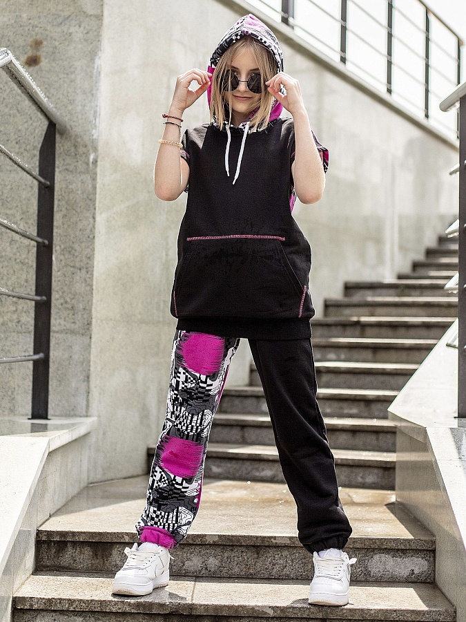 Брюки для девочки спортивные черные с принтом на одной штанине.