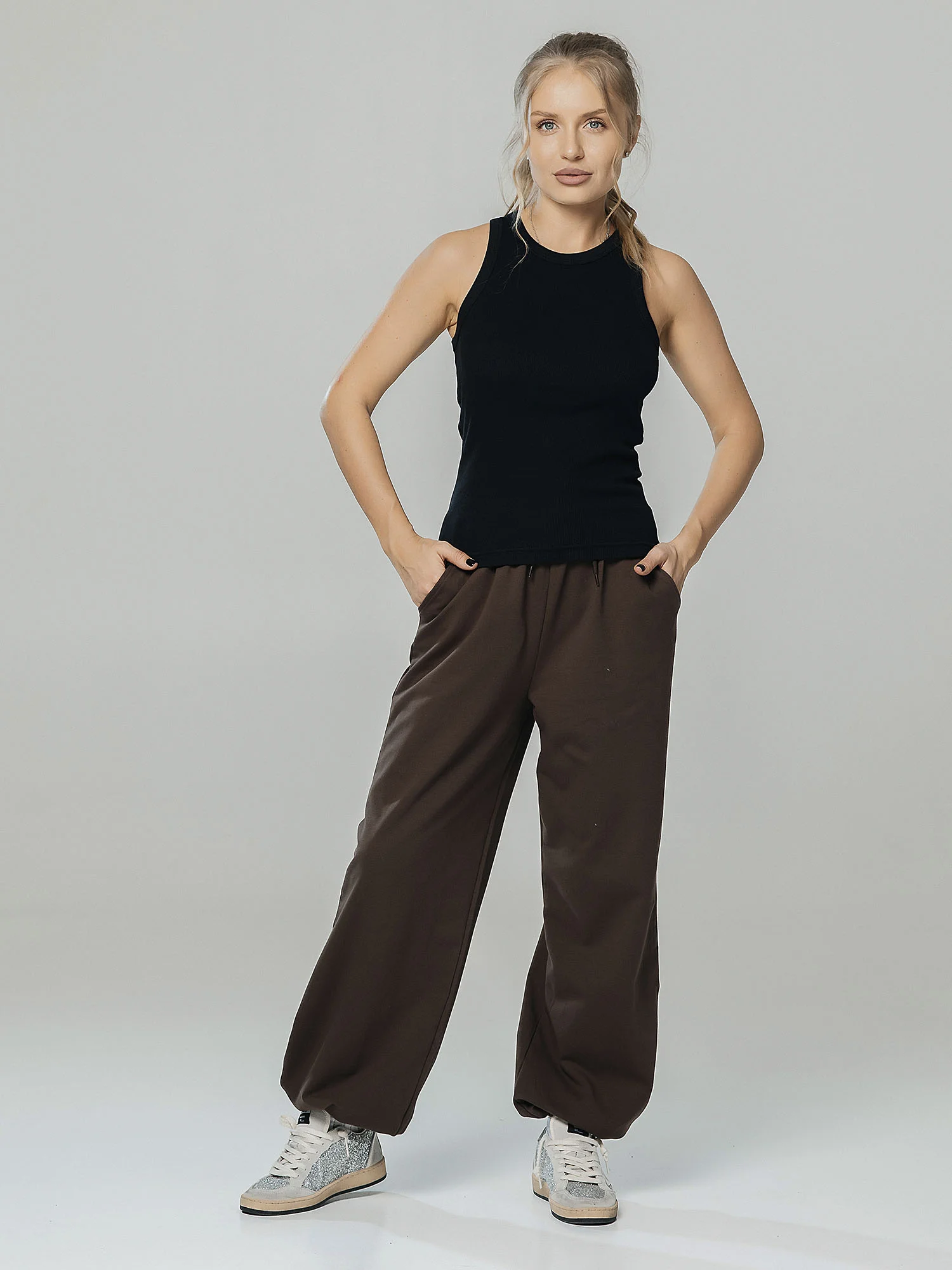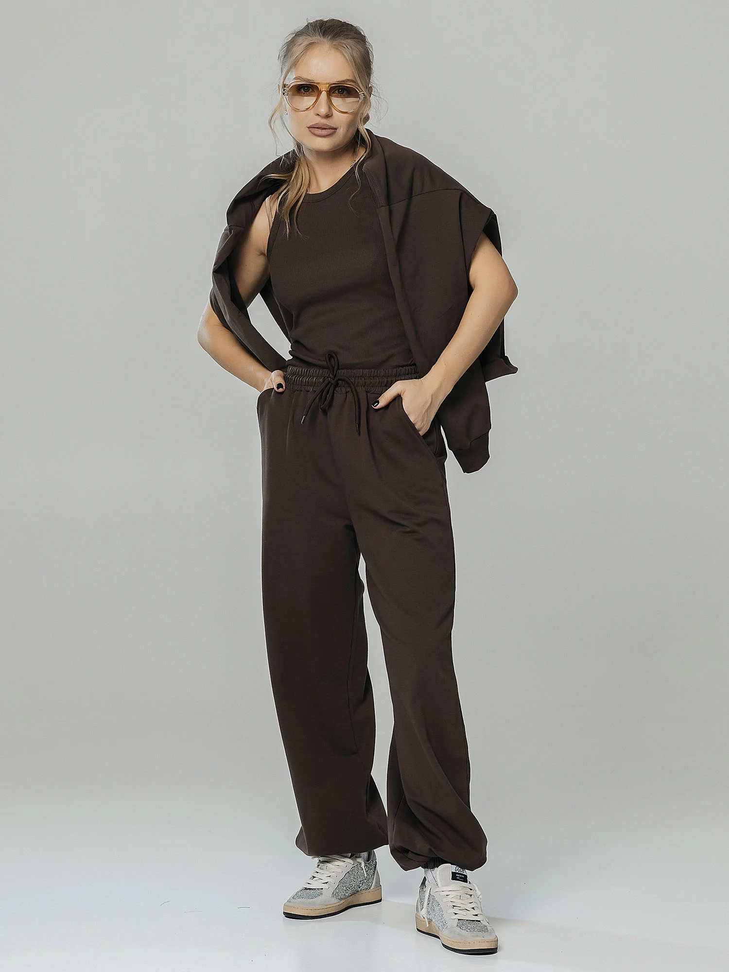 Брюки унисекс шоколадного цвета — удобная базовая модель на каждый день. Комфортная посадка, практичный оттенок и мягкий материал обеспечивают свободу движений. Легко сочетаются с худи, футболками и свитшотами.