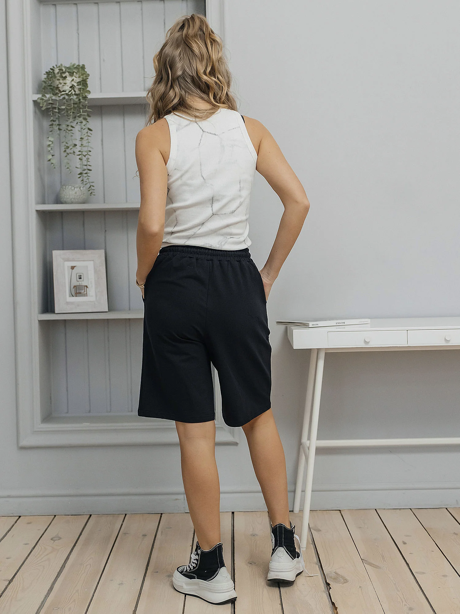 Шорты унисекс удлинённые из футера 2-х нитки (95% хлопок, 5% эластан). Мягкий и эластичный материал приятно прилегает к телу, хорошо держит форму и подходит для активного ритма дня. Комфортная посадка и универсальный крой делают модель практичным выбором на каждый день. Цвет — чёрный.