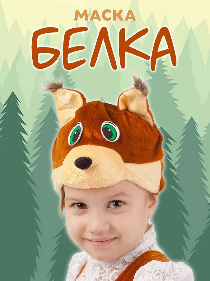 Маска Белка представляет собой шапочку с пришитыми к ней глазками, носиком и ушками. Цвет бежево-коричневый. Ушки с кисточками. Глазки зеленого цвета. Может носиться как вместе с карнавальным костюмом Белка из коллекции Пуговка, так и с другими костюмами, в том числе и сшитыми самостоятельно.