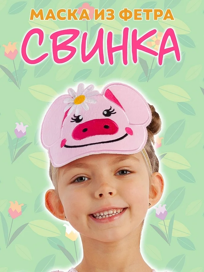 Маска карнавальная из фетра Свинка на резинке. Фетровая маска надевается на голову и имеет универсальный размер для девочек и мальчиков от 3 лет. Эластичная мягкая резинка крепко пришита с изнаночной стороны. Комфортно садится, не мешает и не тянет. Фетр - нетканый материал войлочного типа отлично держит форму и не мнется.