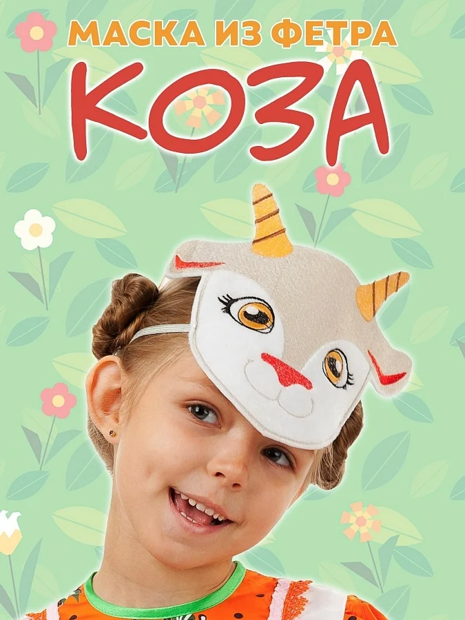 Маска карнавальная из фетра Коза на резинке. Фетровая маска надевается на голову и имеет универсальный размер для девочек и мальчиков от 3 лет. Эластичная мягкая резинка крепко пришита с изнаночной стороны. Комфортно садится, не мешает и не тянет. Гипоаллергенный фетр плотный и приятный на ощупь.