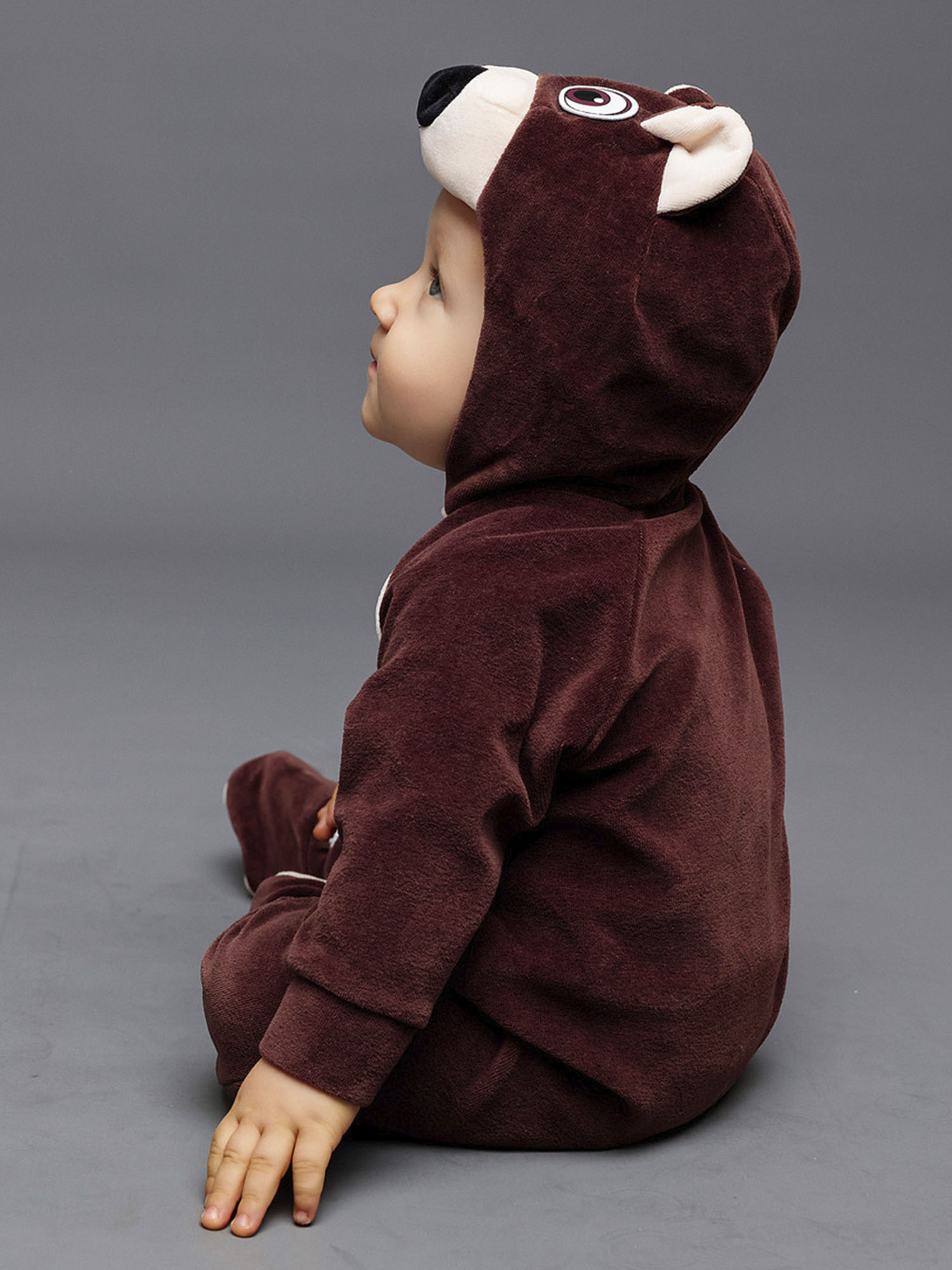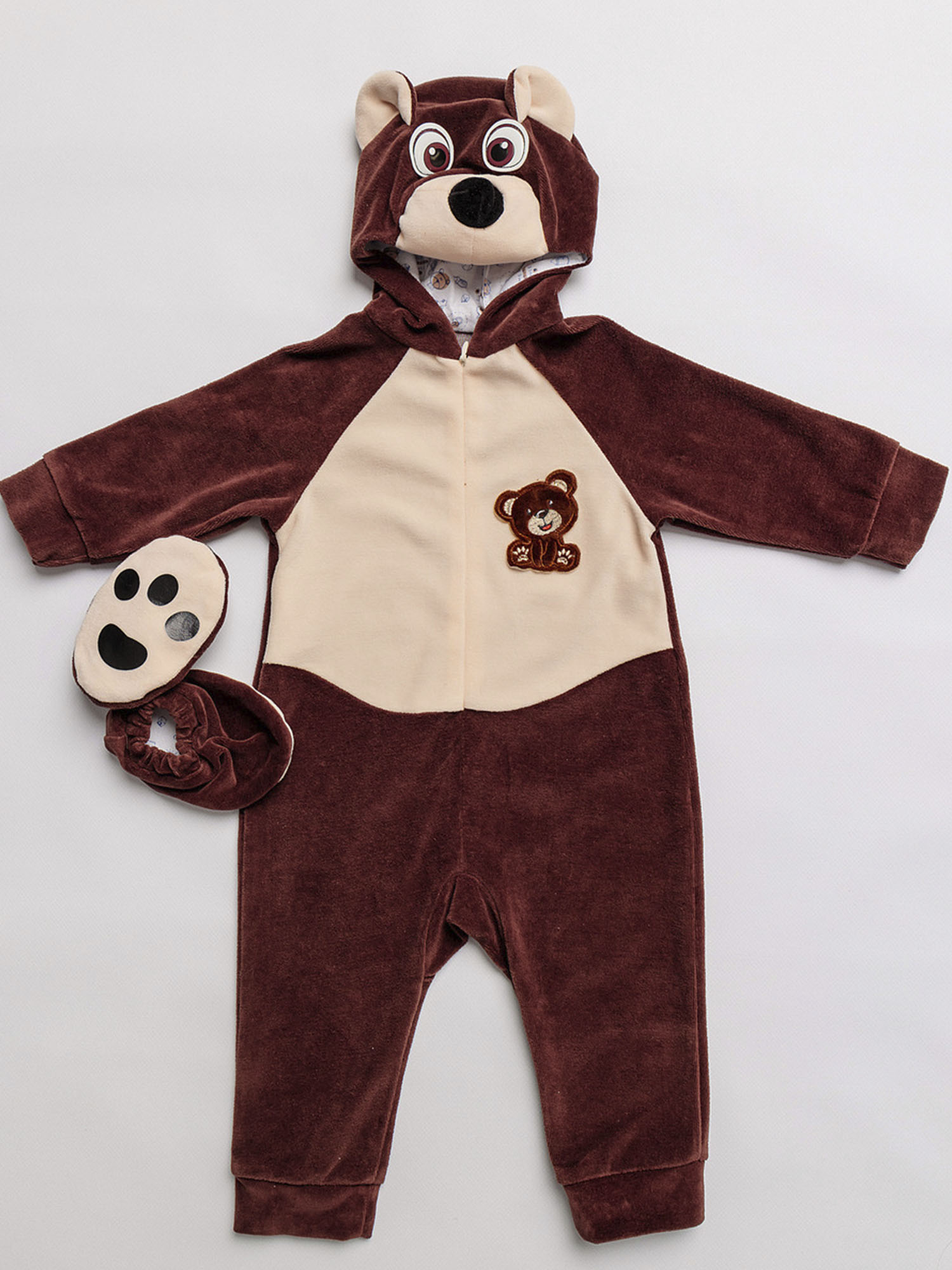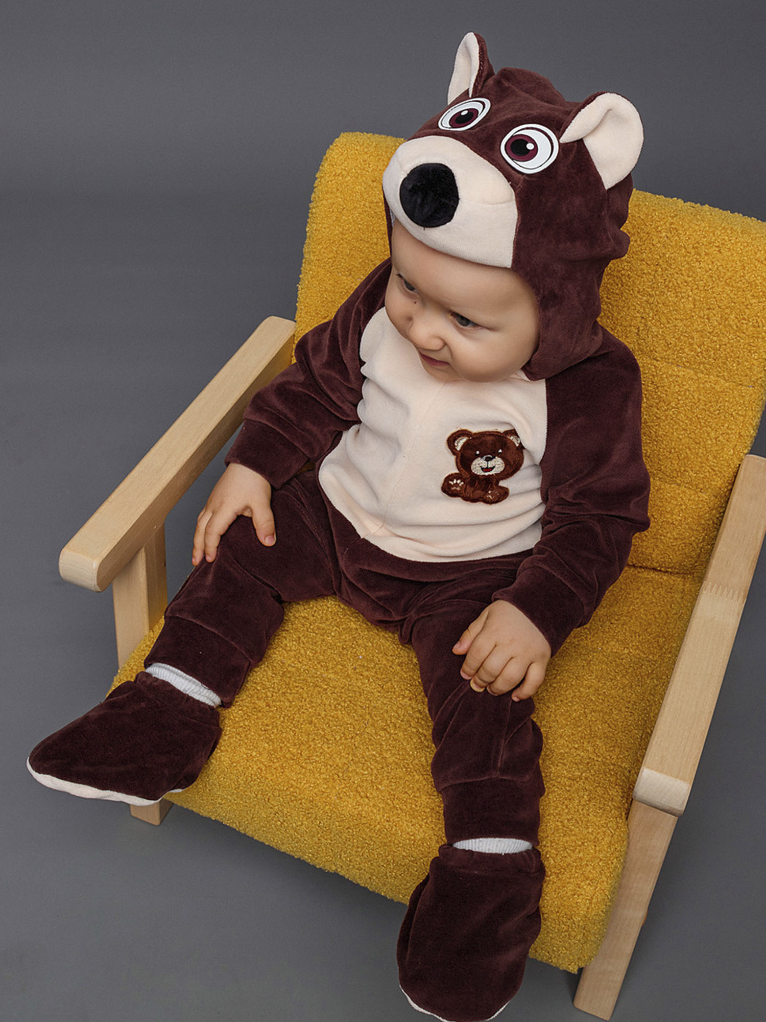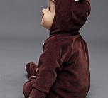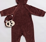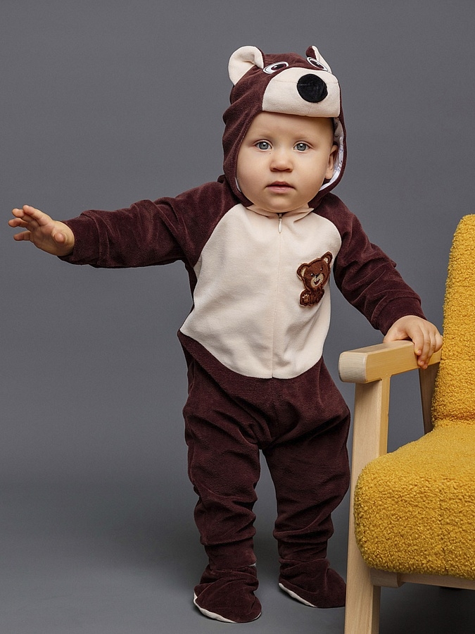 Костюм Медвежонка для новорожденного - чудесный образ славного мишки, в котором можно отправиться на первую фотосессию с малышом или отпраздновать маленькую дату, например, 6 месяцев. Коричневый комбинезон с капюшоном выполнен из 100% хлопка.