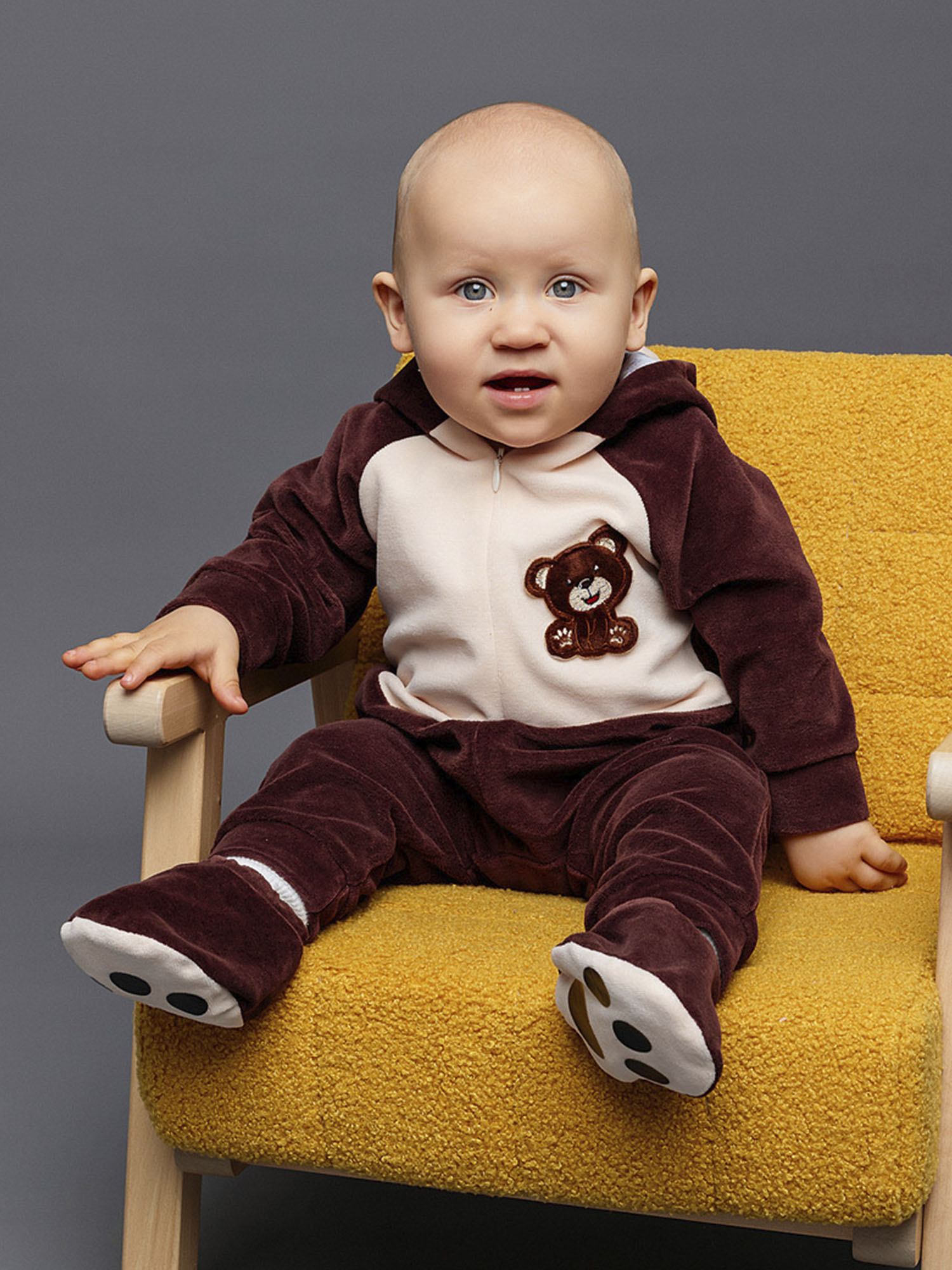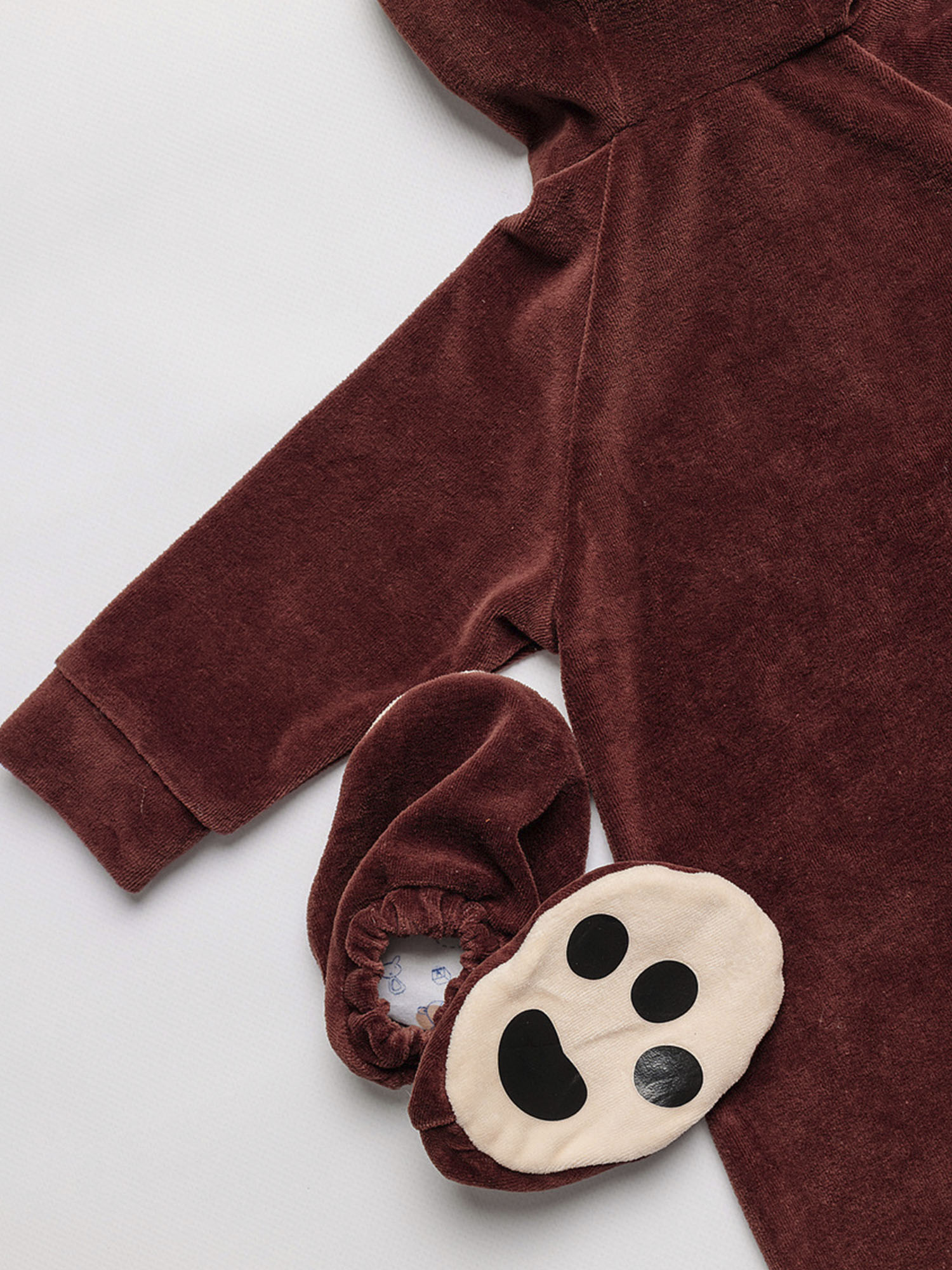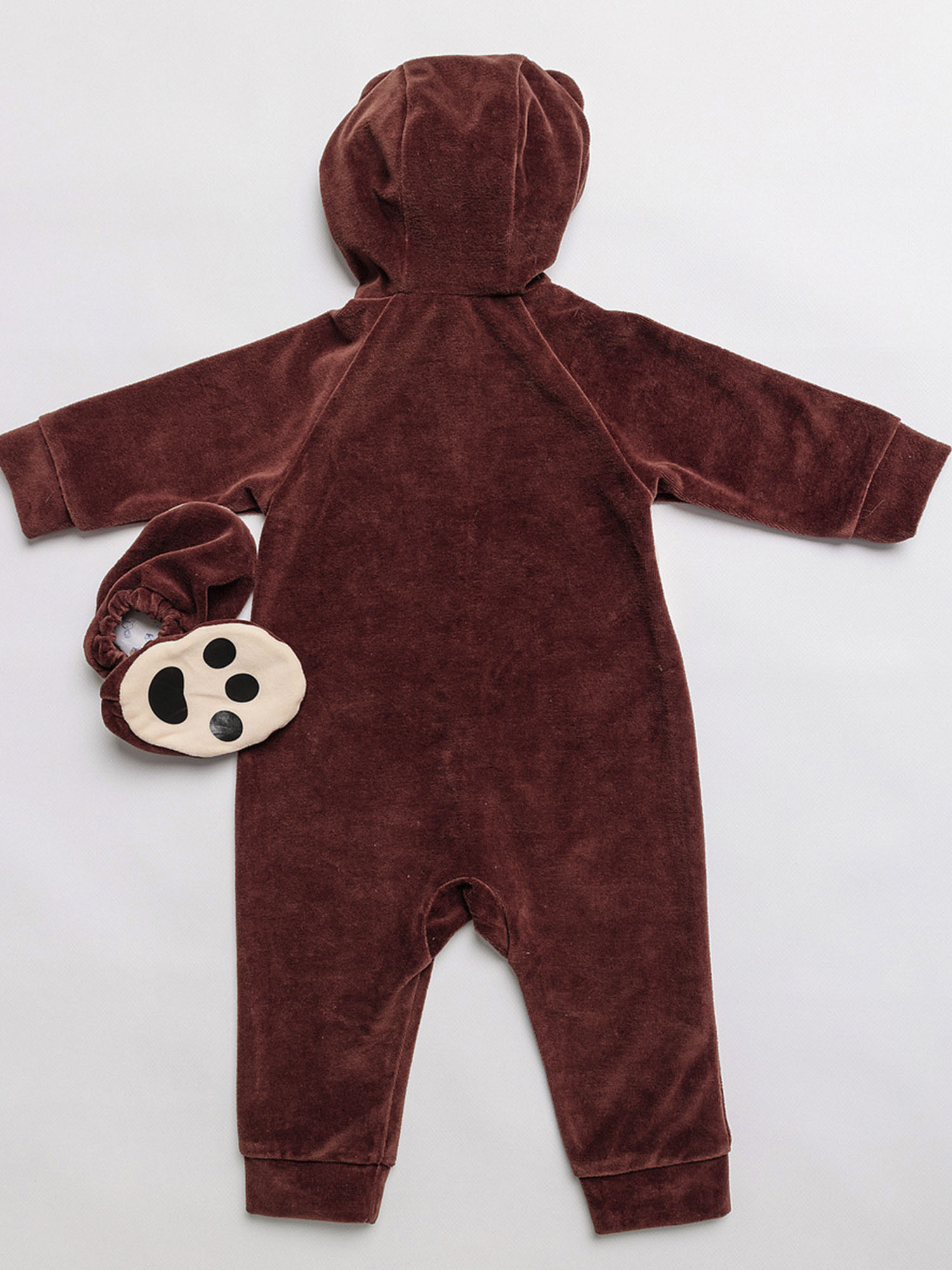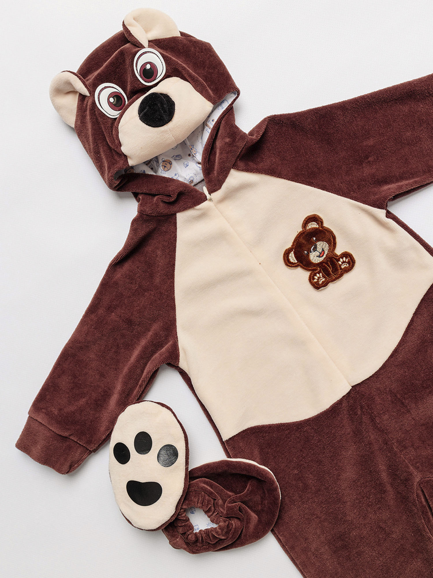 Костюм Медвежонка для новорожденного - чудесный образ славного мишки, в котором можно отправиться на первую фотосессию с малышом или отпраздновать маленькую дату, например, 6 месяцев. Коричневый комбинезон с капюшоном выполнен из 100% хлопка.