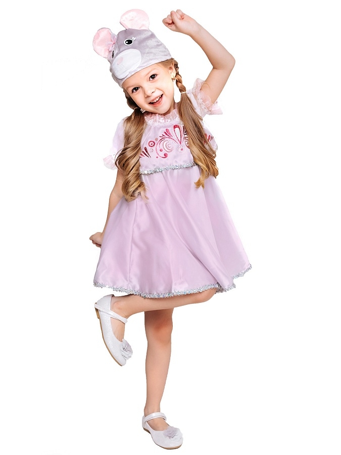 Карнавальный костюм Мышка Иришка розовый для самых милых девочек, собирающихся на новогодний утренник. Трогательный и нежный образ Мышки Иришки представлен в виде платья и шапочки-маски.