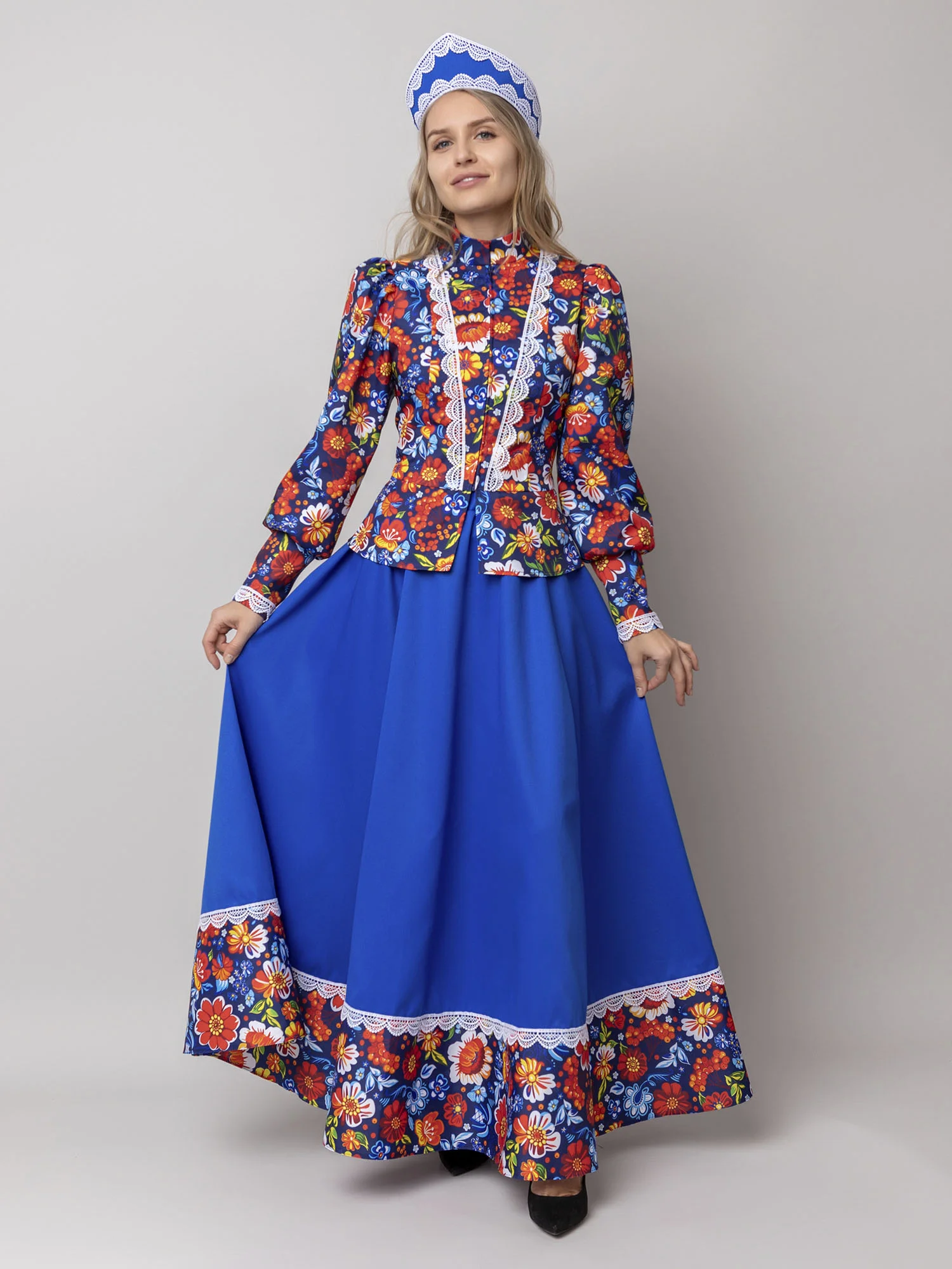 Казачий карнавальный костюм «Ольга» — эффектный образ в традиционном стиле с характерной отделкой и выразительными деталями. Наряд создаёт яркий сценический образ и отлично подойдёт для выступлений, праздников и тематических мероприятий.