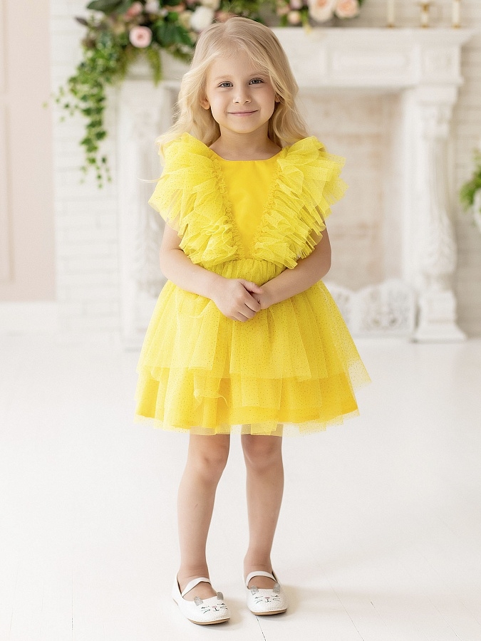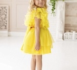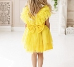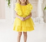 Нарядное платье с пышной юбкой и рюшами из фатина, с декоративным бантом на поясе сзади. На спинке имеется поясок чтобы дополнительно утянуть талию. Подкладка 100% хлопок.