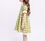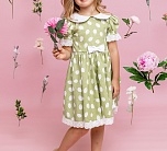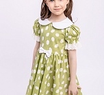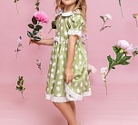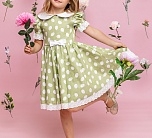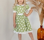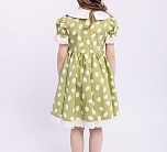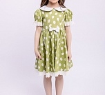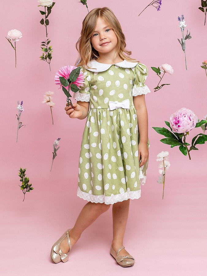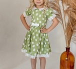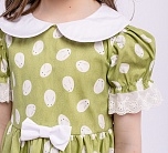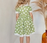 Нарядное зеленое летнее платье с пышной юбкой. Отложной воротник и бант из однотонной ткани, тесьма по низу юбки и рукавов. Ткань 100% хлопок. Украшено белым узором. Длина миди.