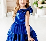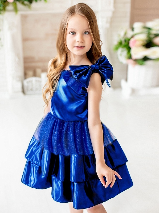 Нарядное платье синего цвета с пышной юбкой, декоративным бантом на плече. Яркое атласное платье с коротким рукавом и пышным подъюбником. Подклад хлопок 100%.