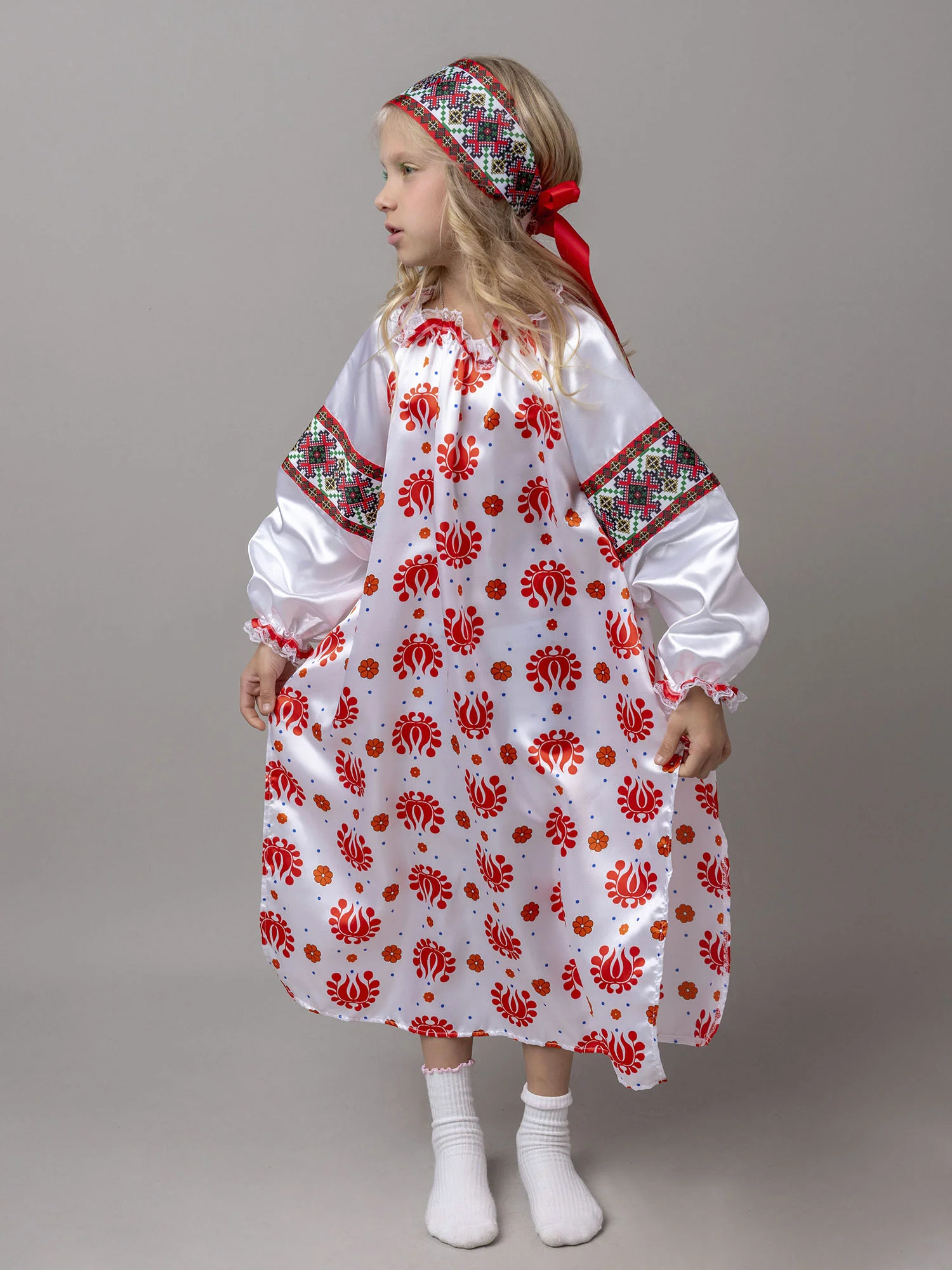 Костюм Агафья — народный образ в традиционном стиле. В комплект входит платье-рубашка, пышная юбка и повязка на голову. Отличный вариант для тематических праздников, фольклорных выступлений и школьных постановок.
