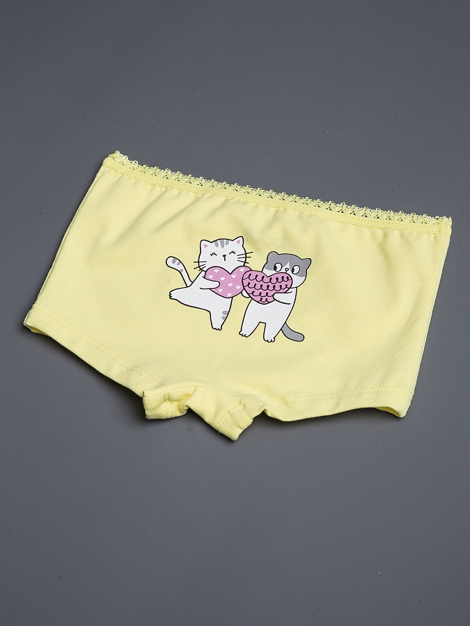 Детские трусы-шортики для девочки желтого цвета. Мягкие и комфортные трусики из нежного супрема пенье, которые обеспечивают идеальную посадку и не раздражают кожу. Эластичная ткань с добавлением лайкры мягко облегает, не сдавливая, а натуральный хлопок позволяет коже дышать. Приятный желтый цвет и милый рисунок в виде котиков. Удобная резинка не перетягивает и не оставляет следов на теле.