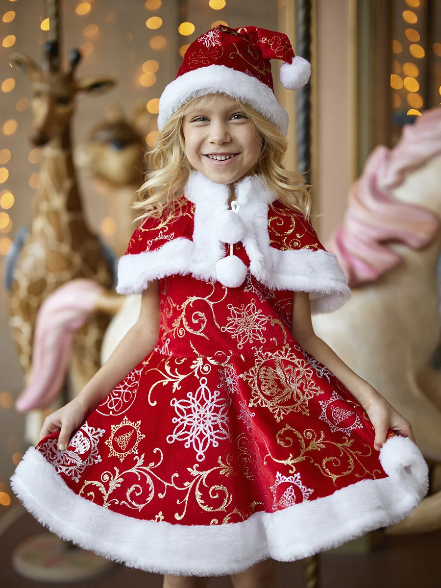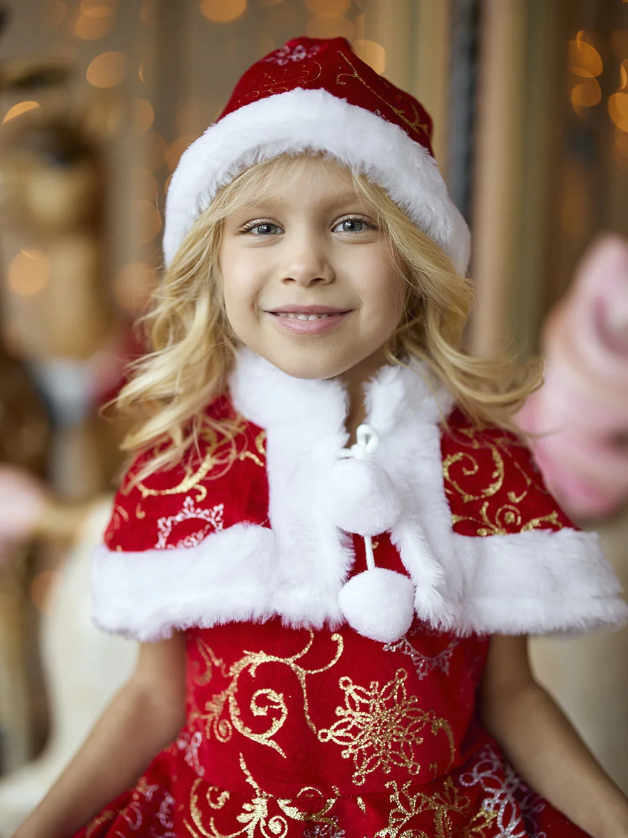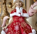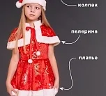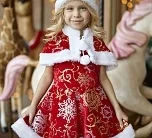 Карнавальный костюм Мисс Санта для девочек новогодний. В комплекте платье, накидка и шапочка. Новогодний костюм Мисс Санта выполнен в красном цвете с блестящими узорами. Это стильный и симпатичный образ для девочки, которая хочет быть главной на новогоднем празднике.