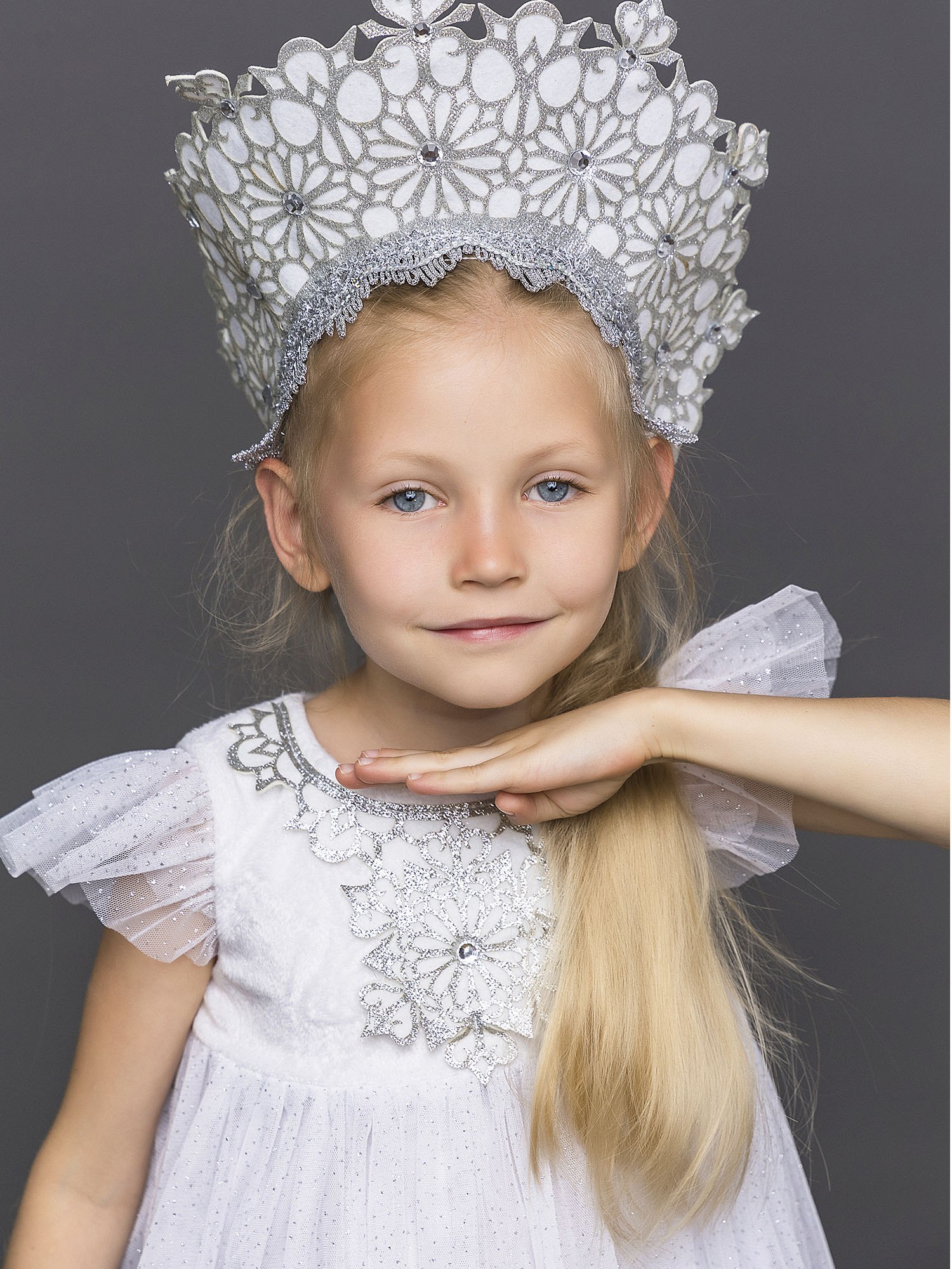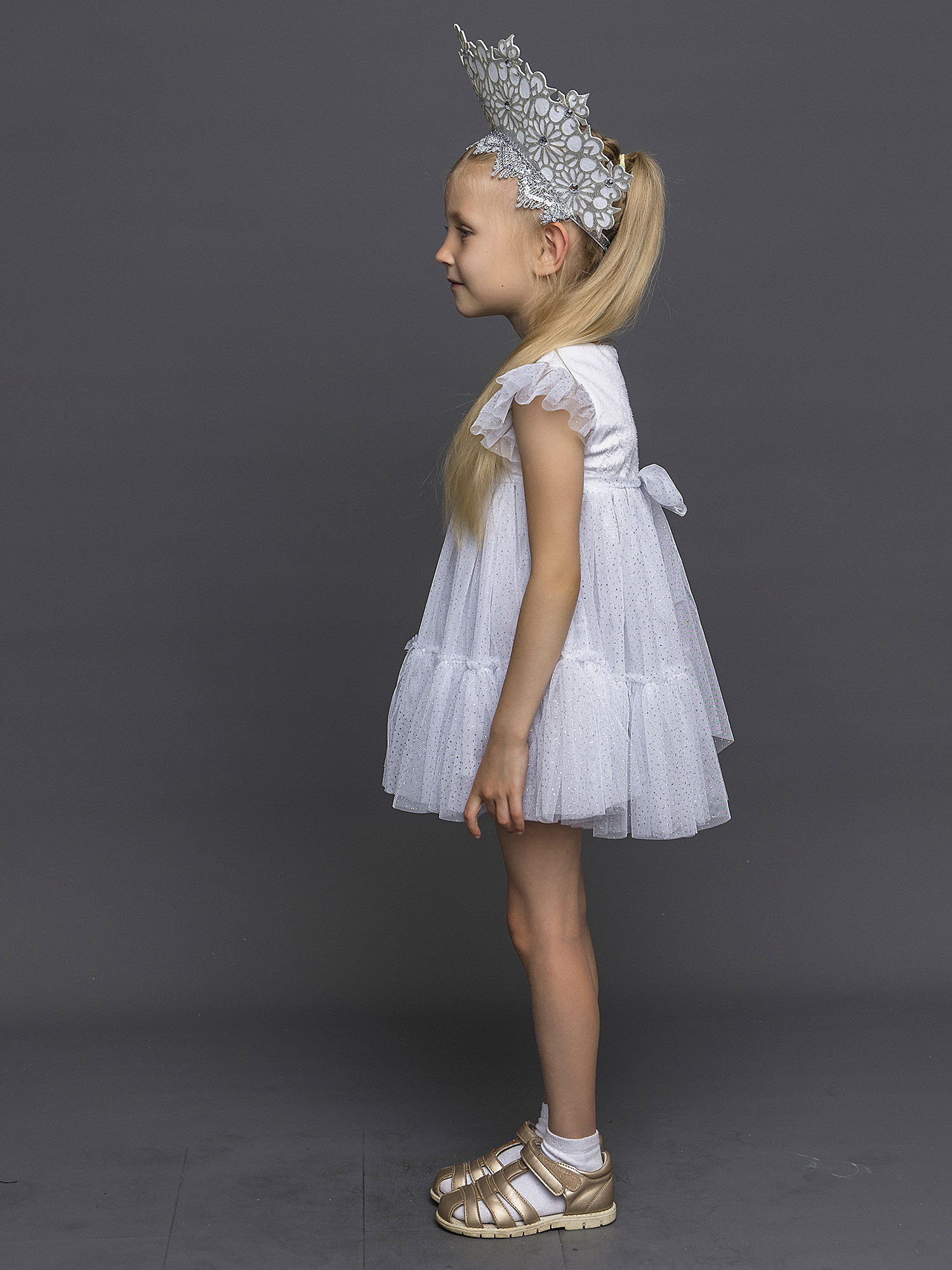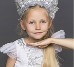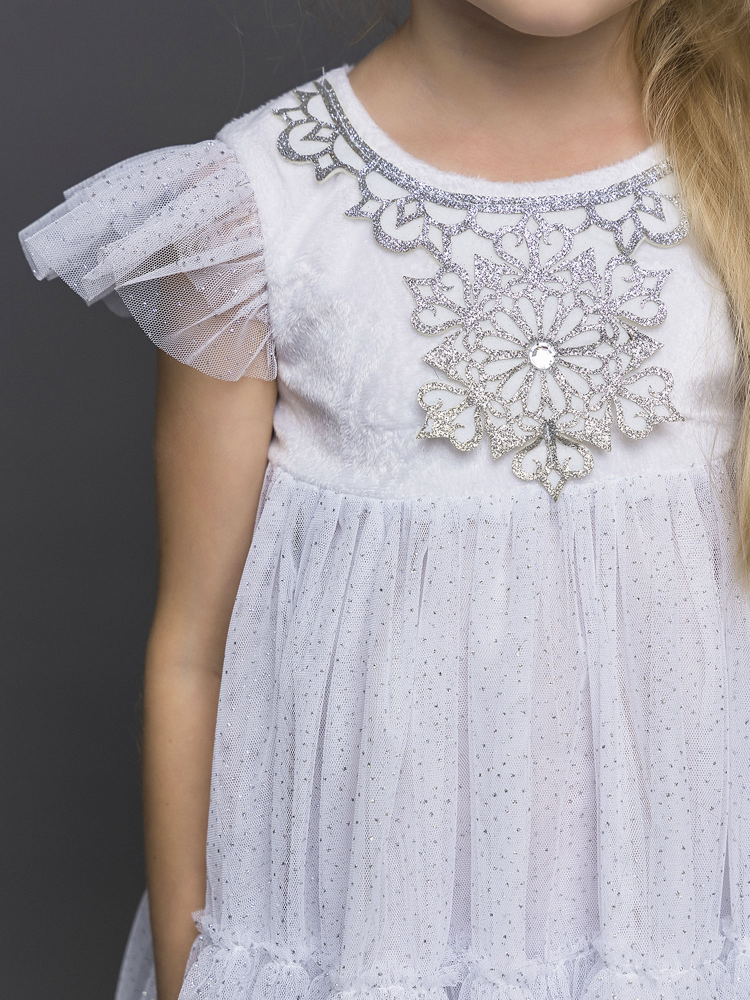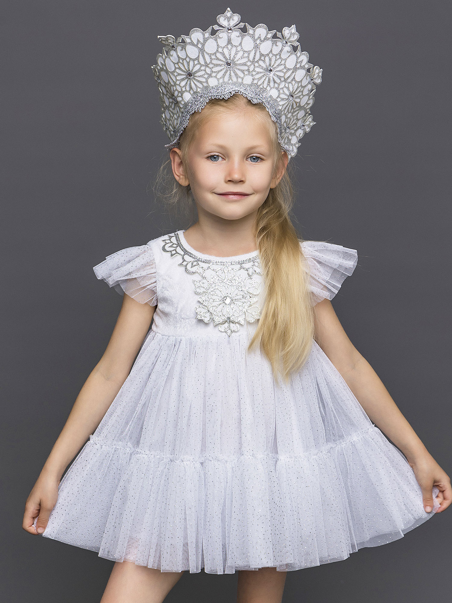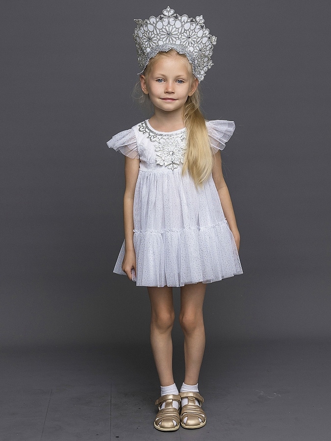 Карнавальный костюм Снежинка Элли для девочки 3-5 лет на утренник. В комплекте платье с подъюбником и кокошник. Фетровые нашивки со стразами на груди, блестящая юбка и рукава. Кокошник с тесьмой, узорами и стразами.