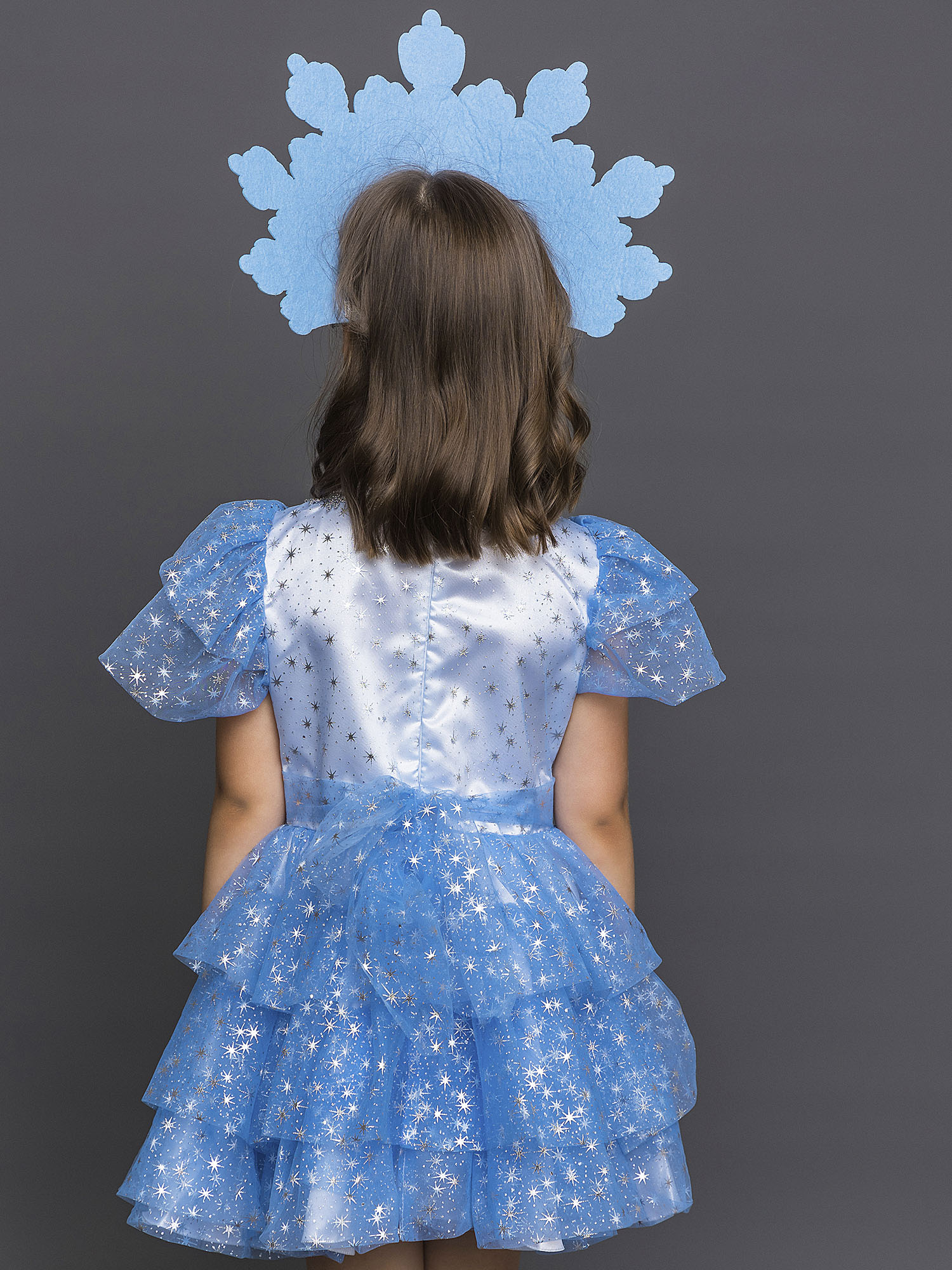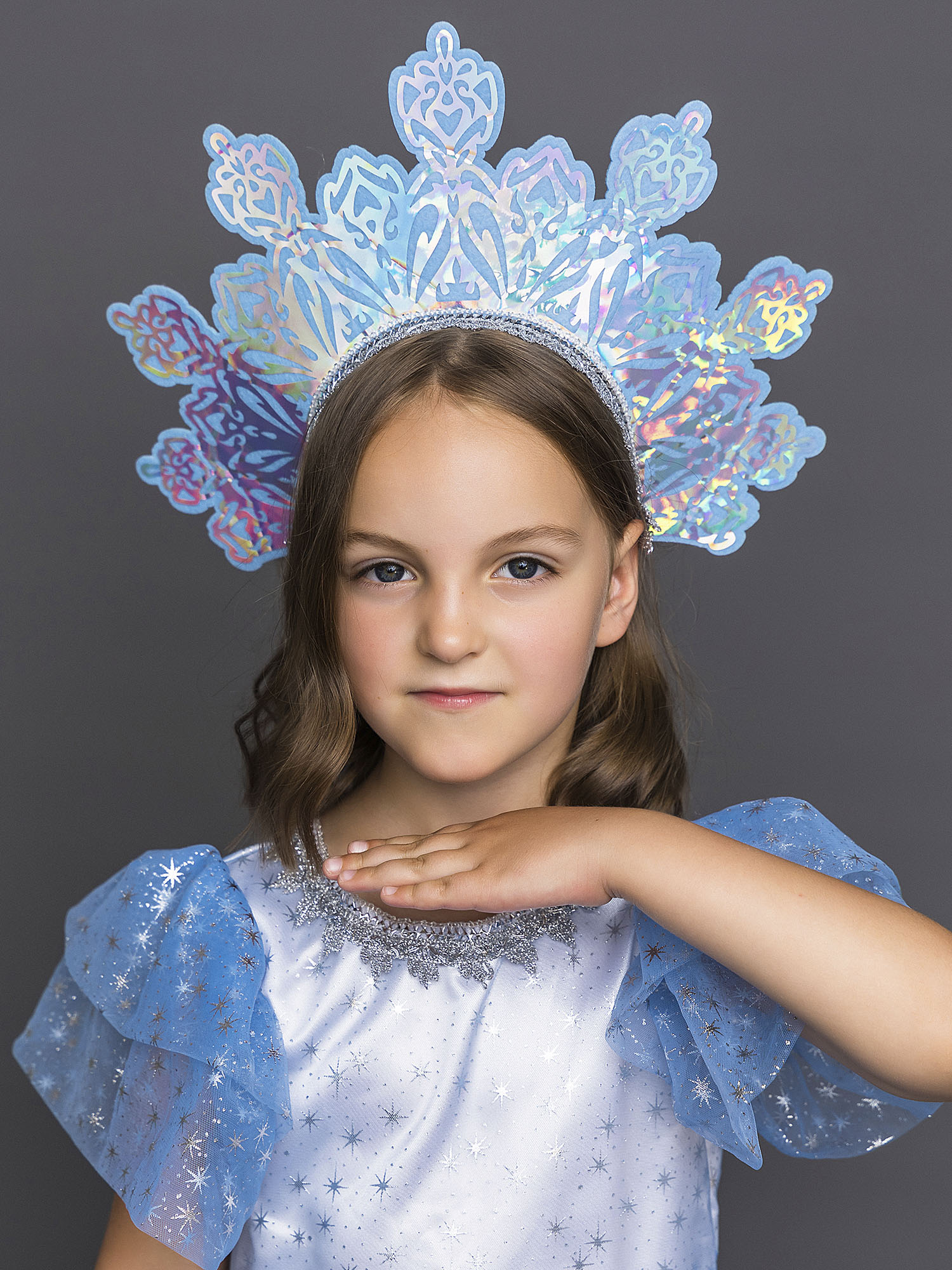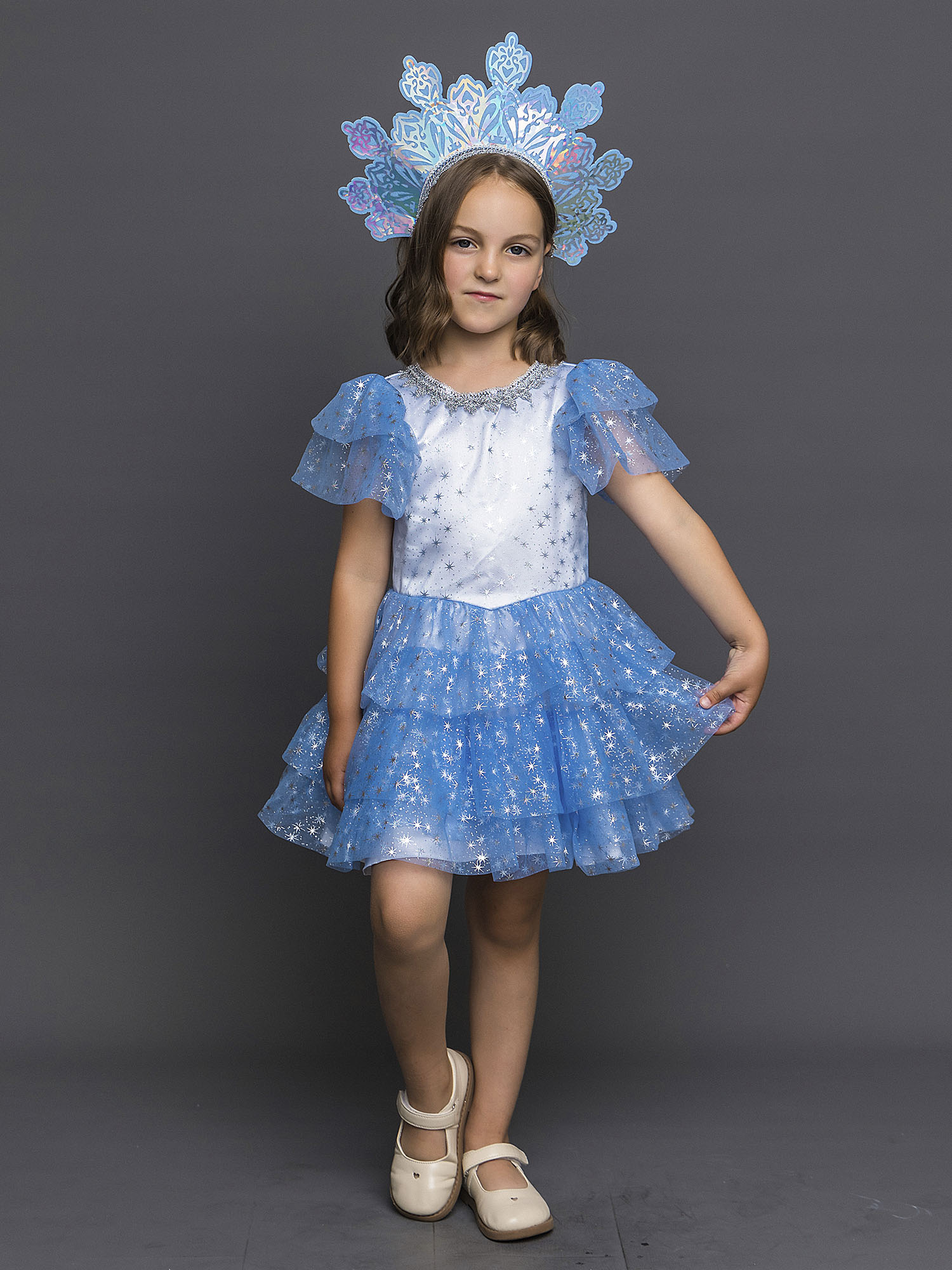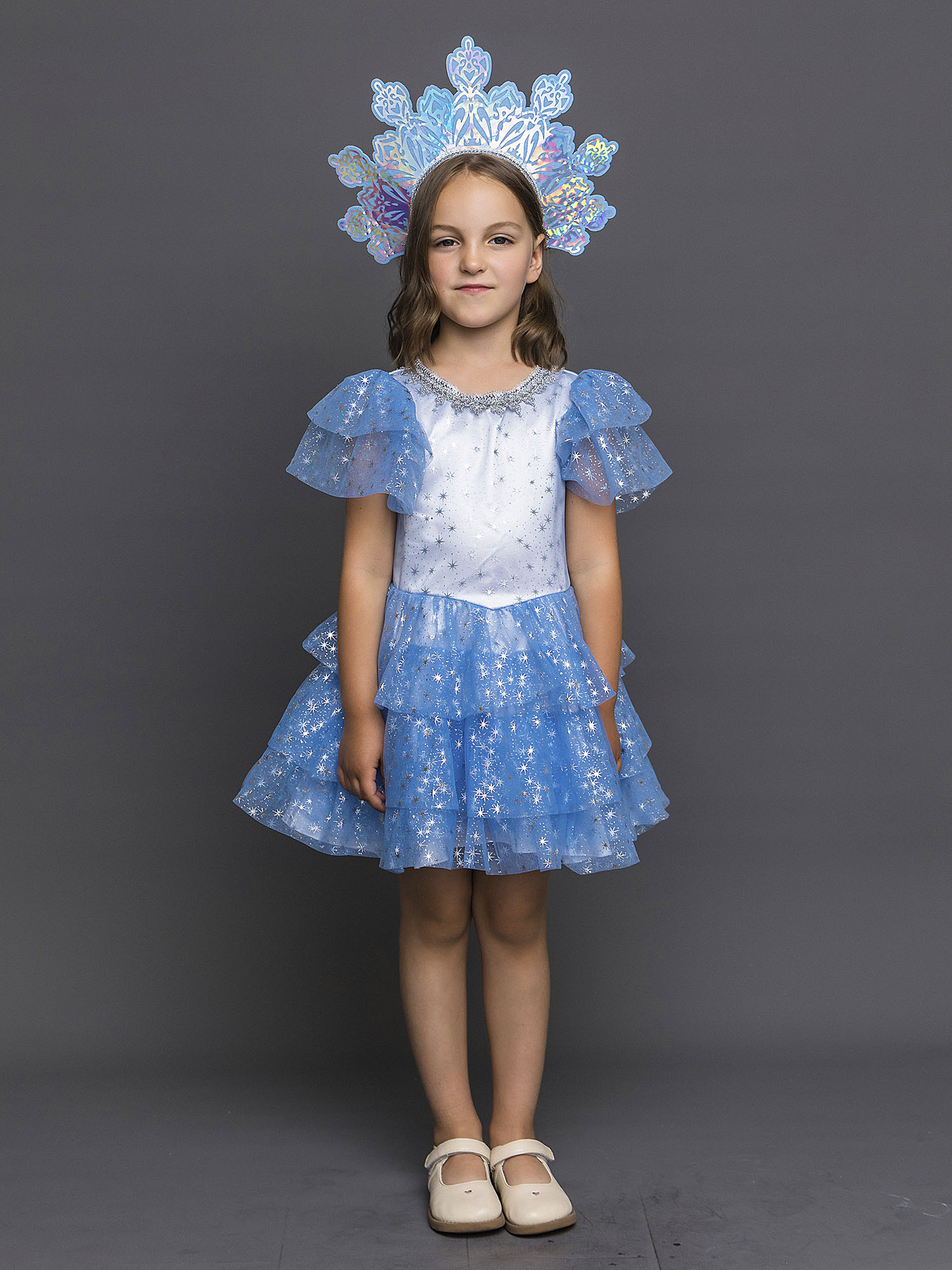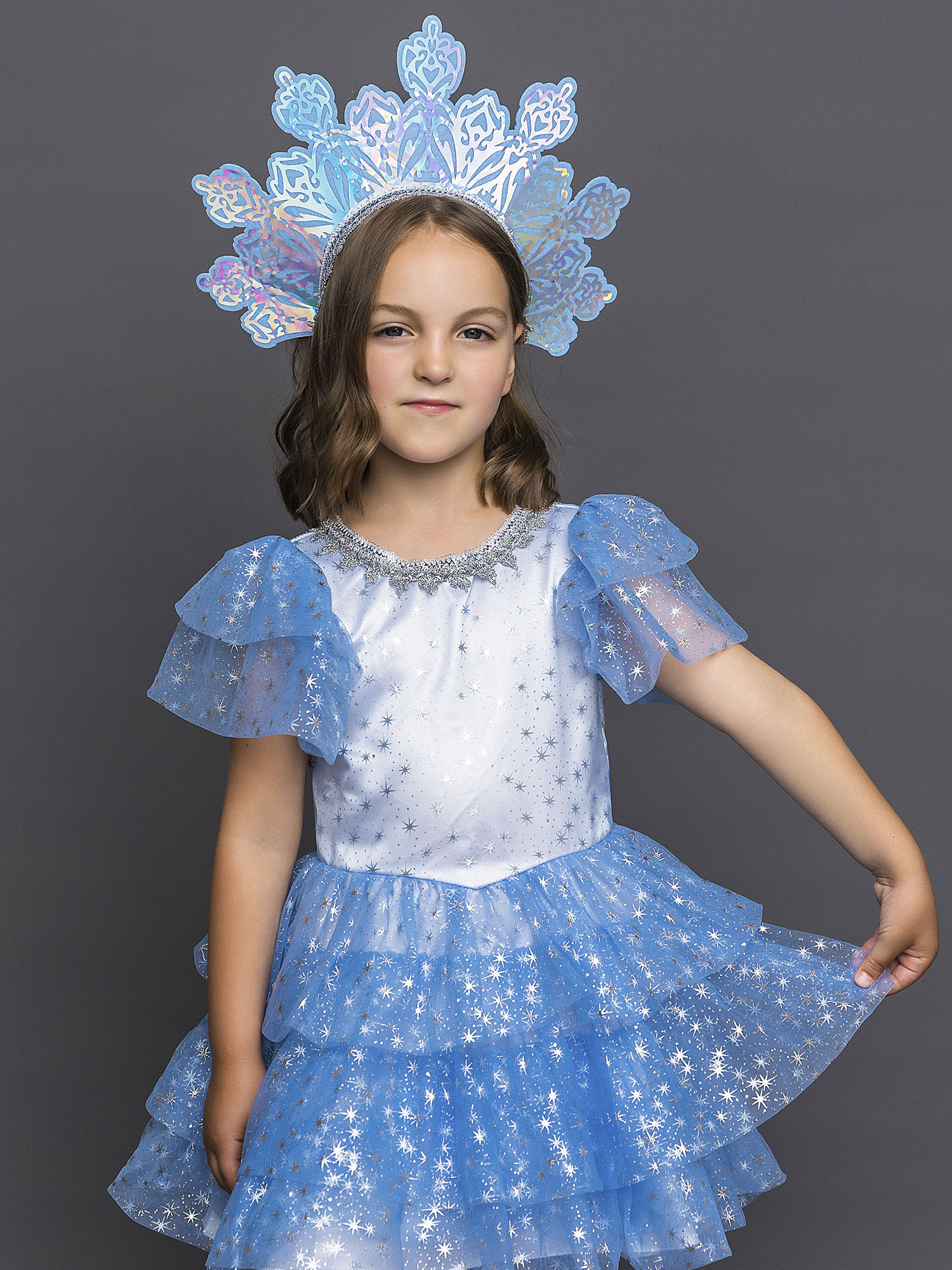 Костюм Снежинка Эмма представляет собой изысканное пышное платье, выполненное с тремя ярусами сборки сетки на юбке, что придает ему волшебный и воздушный вид. Спинка платья оснащена утяжкой, что обеспечивает идеальную посадку и комфорт при носке. Кокошник, который идет в комплекте, надежно фиксируется на голове благодаря резинке, дополняя образ сказочной снежинки. Этот костюм идеально подходит для карнавальных мероприятий, утренников и праздничных выступлений.