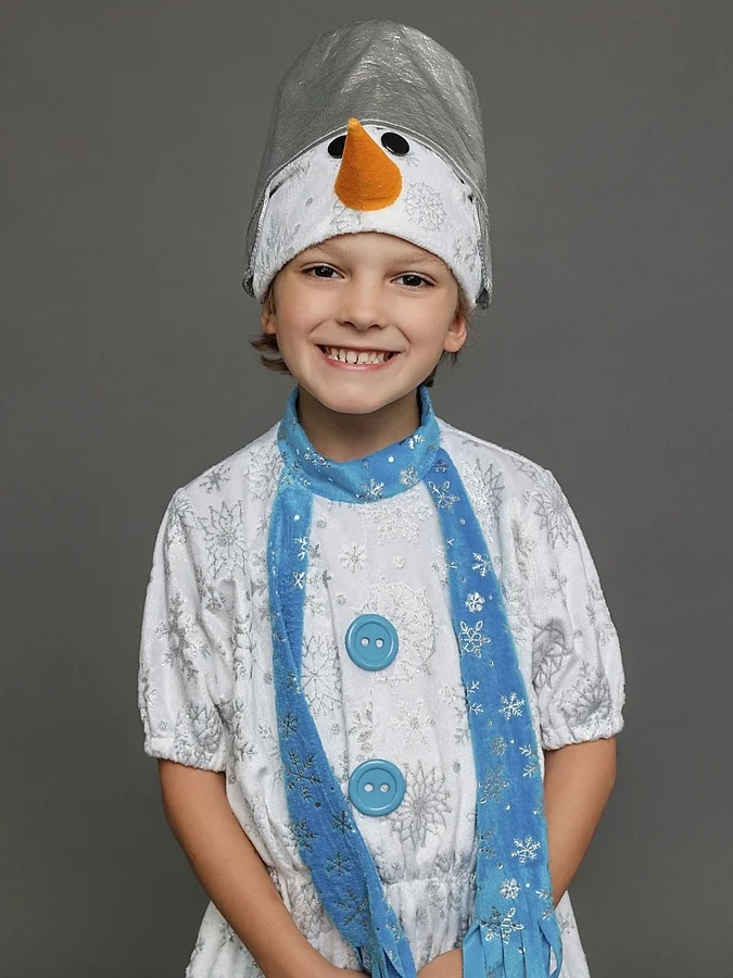 Мальчик, который придет на праздник в костюме Снеговика, непременно будет в центре всеобщего внимания. Отличный выбор для ребенка 3-5 лет, который отправляется на праздничный утренник или новогоднюю елку. Костюм белого цвета имеет удобный крой, не стесняющий движений. В образе очень красиво расставлены цветовые акценты, так, например, цвет шарфика перекликается с цветом башмачков. А главной изюминкой образа стало блестящее ведерко.