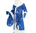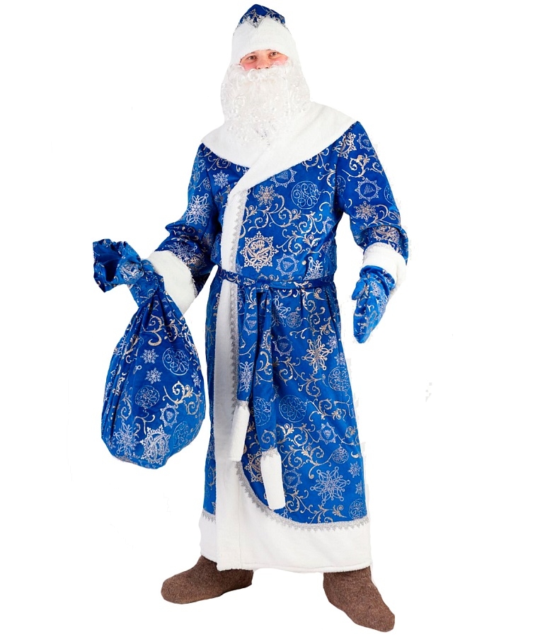 Костюм Деда Мороза в синей расцветке для взрослых. Эффектный новогодний образ для утренников и корпоративов. В комплект входит шуба с поясом, мешок для подарков, борода, шапка и варежки.