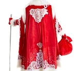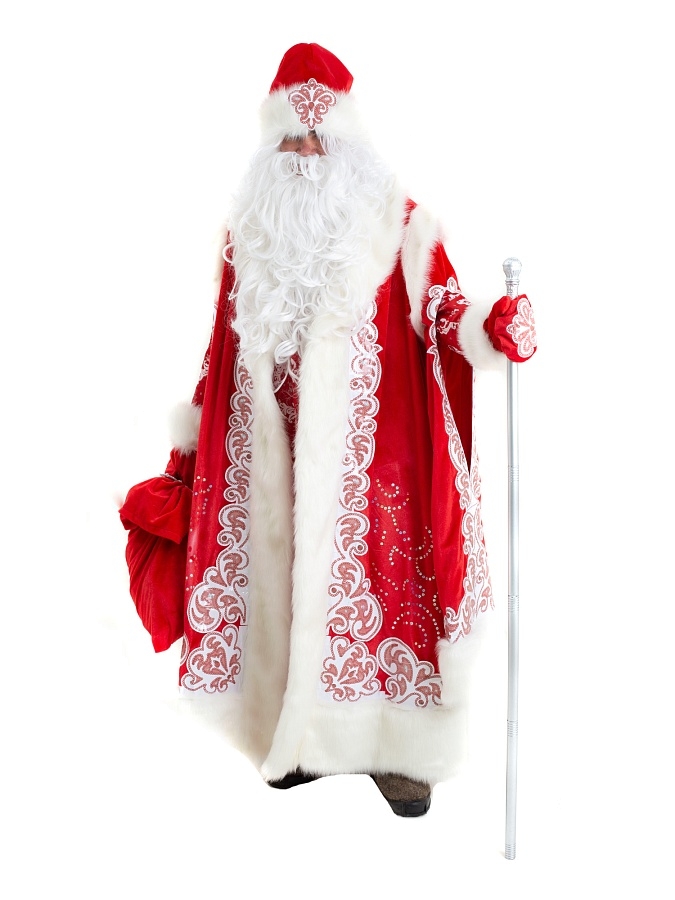 Костюм Дед Мороз Боярский Батик - эффектный и дорогой наряд для тех, кто хочет выглядеть как настоящий новогодний волшебник. В комплект костюма, пошитого из красной парчи и белого меха, входит шуба, шапка, варежки, мешок, посох, парик, борода, рубашка.