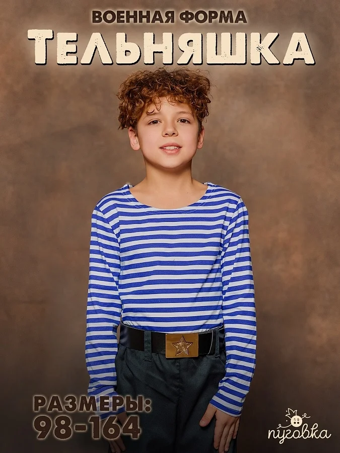 Тельняшка для детей ко дню ВДВ, ВМФ и другим праздникам. Качественная хлопковая тельняшка с длинным рукавом и круглой горловиной выпускается в размерах для мальчиков от 4-х лет.