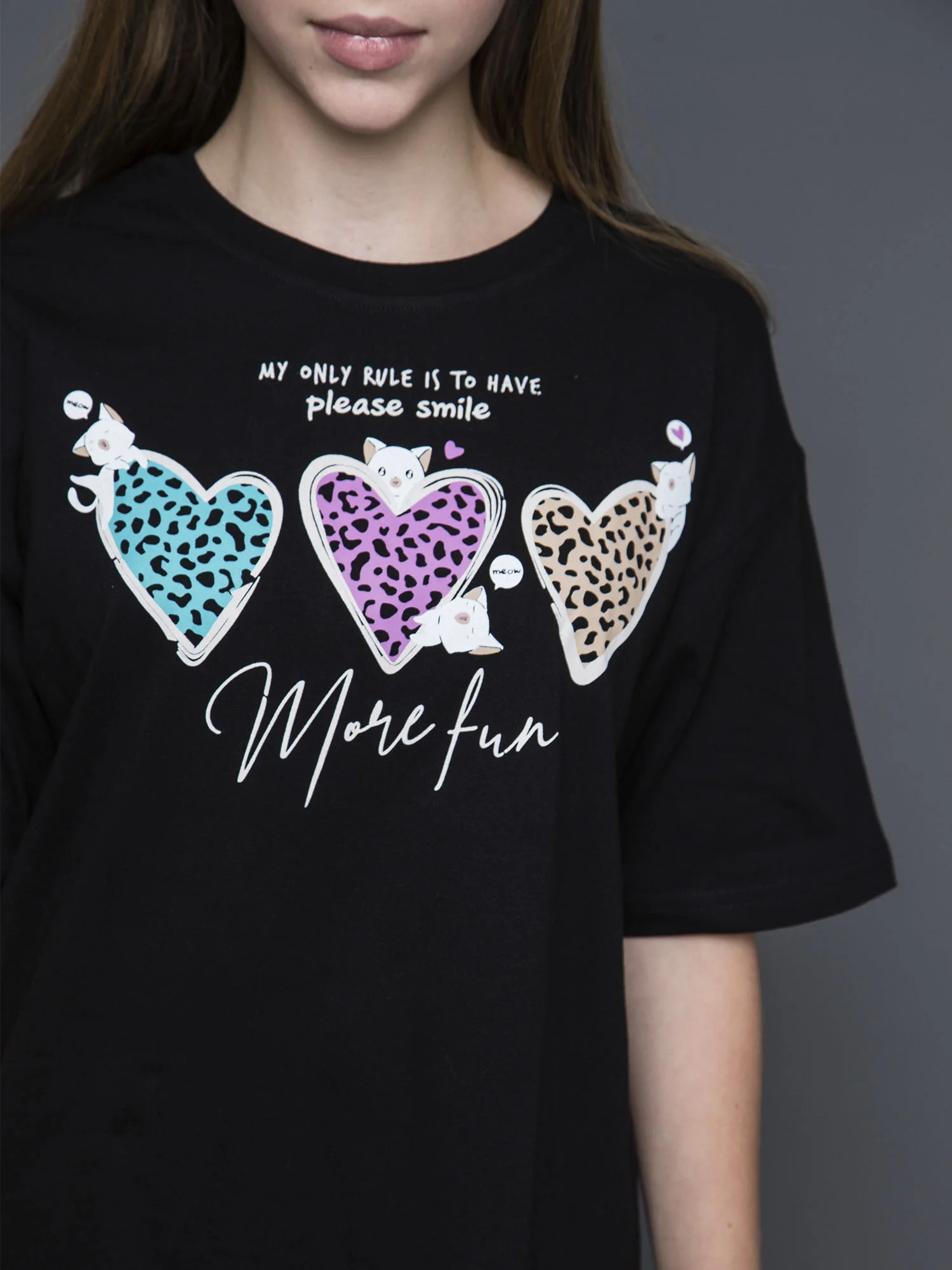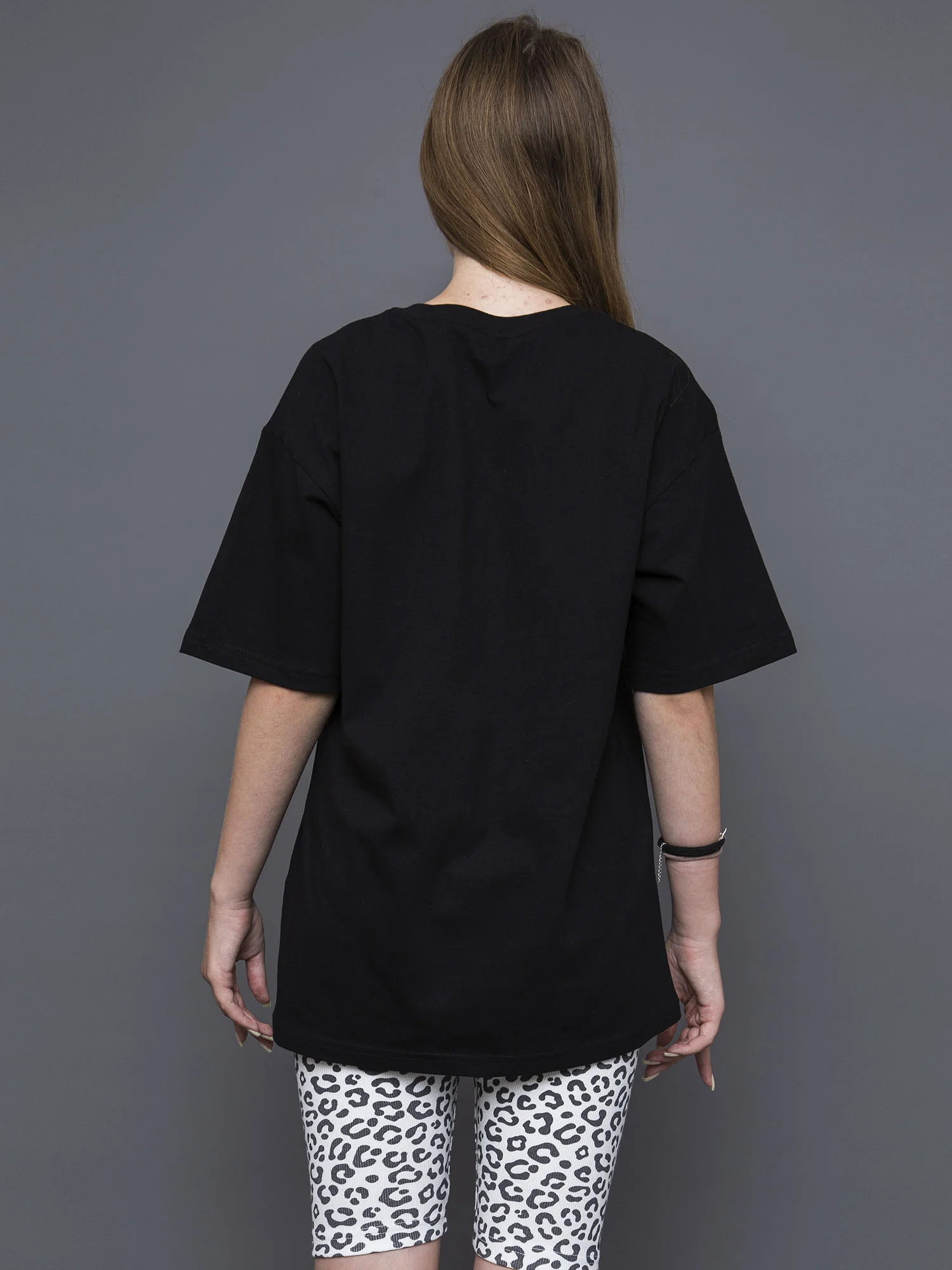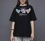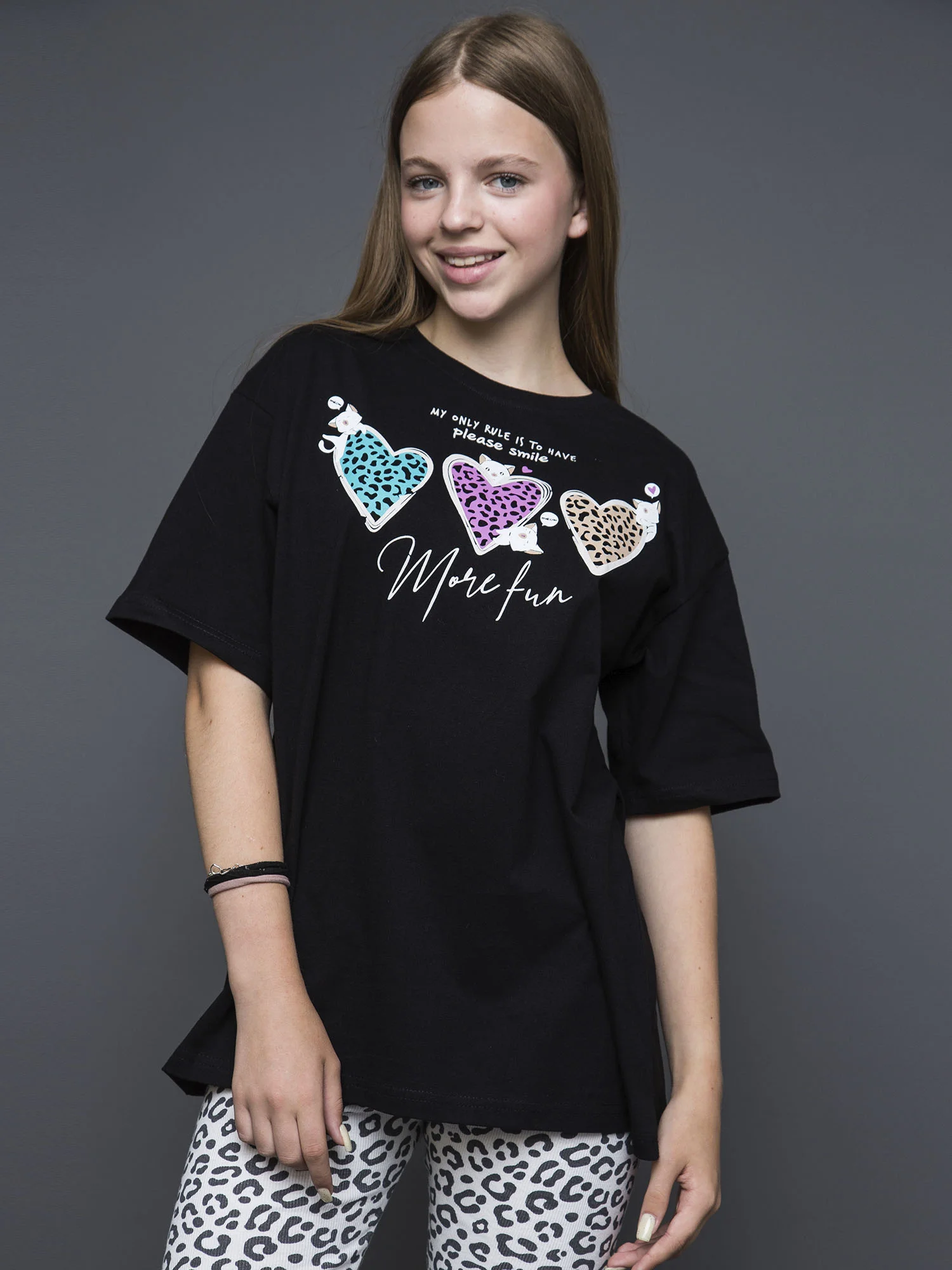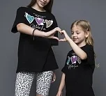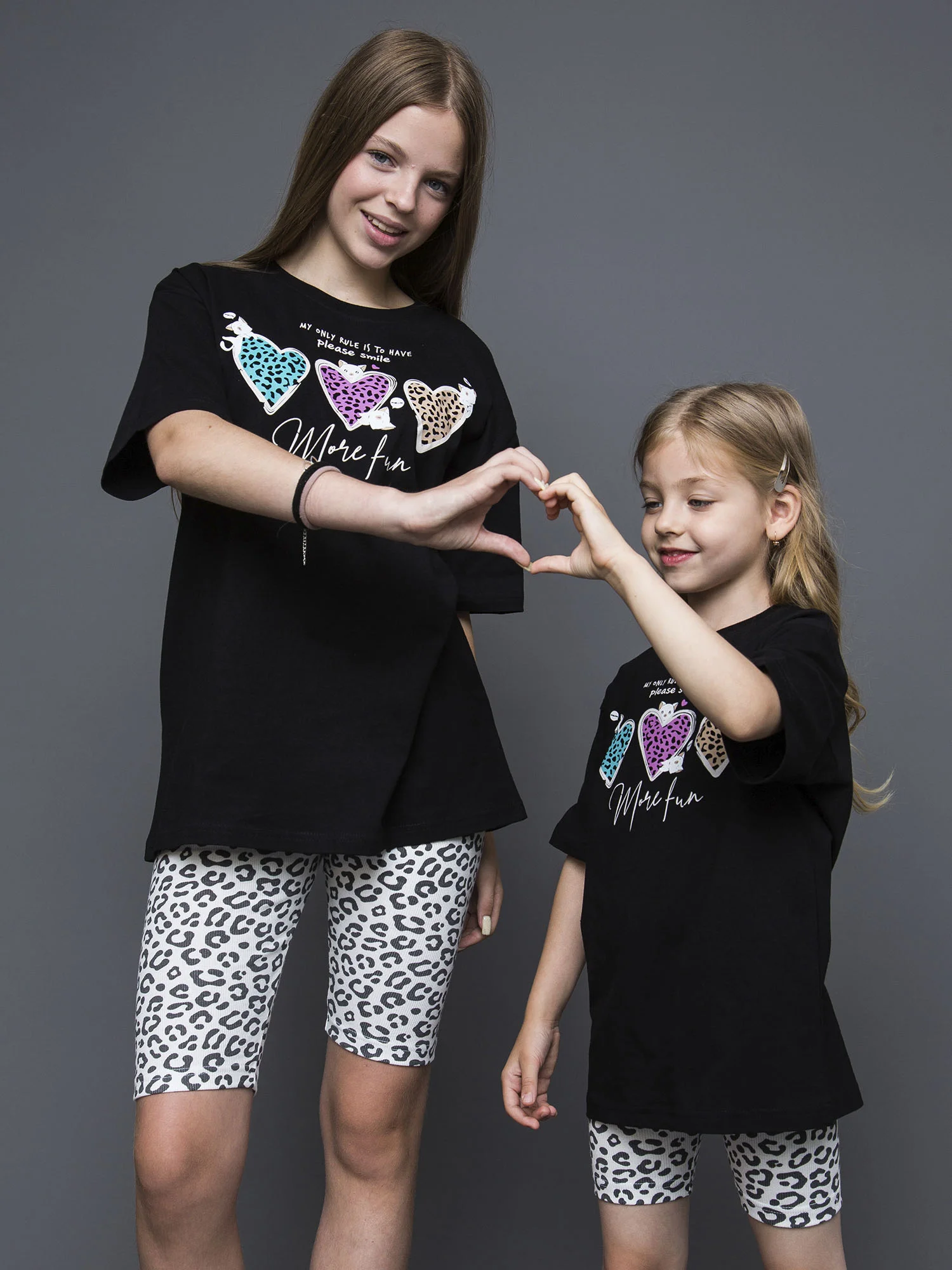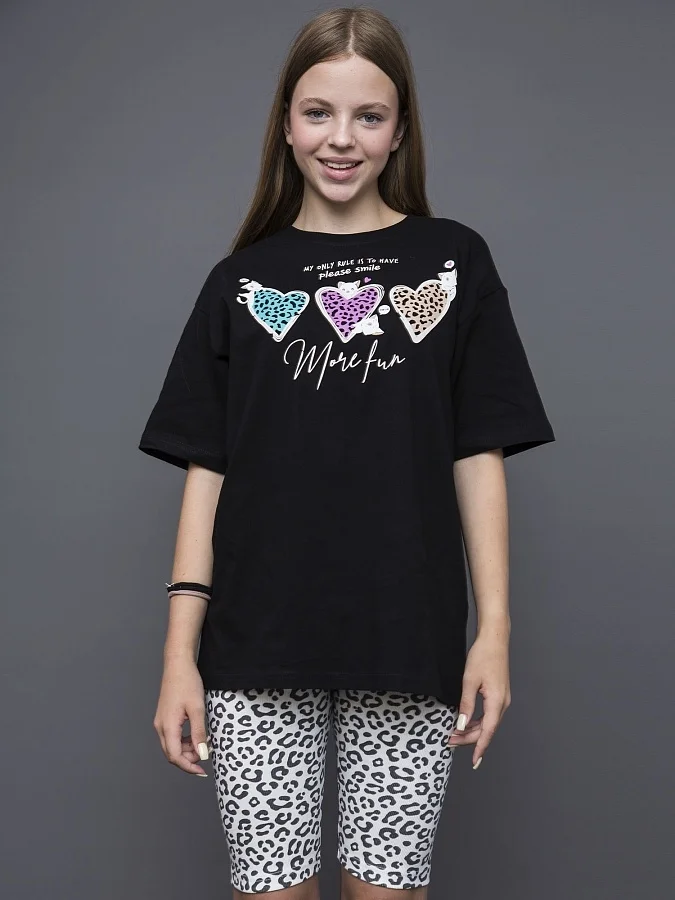 Мягкий и комфортный пижамный комплект для девочки. Состоит из черной футболки с коротким рукавом и шортиков в модном бежевом оттенке с леопардовым принтом. Нежная ткань – приятная к телу, не вызывает раздражения. Резинка на шортах не давит, футболка легко надевается. Идеально для дома, поездок и сладких снов.