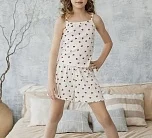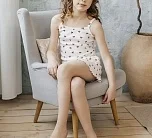 Комплект (майка и шорты) выполнен из кашкорсе: 95% хлопок, 5% эластан. Мягкий, эластичный и приятный к телу материал обеспечивает комфорт в течение дня. Цвет — молочный.