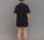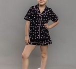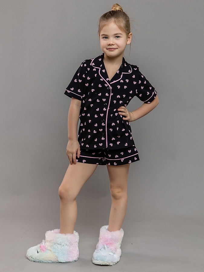 Комплект для девочки трикотажный черный: футболка с коротким рукавом и шорты. Футболка с застежкой на пуговицы и отложным воротником и шорты свободного кроя. Комплект подойдет в качестве пижамы или домашней одежды. Принт в розовое сердечко.
