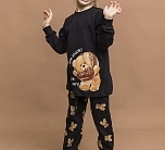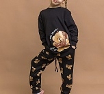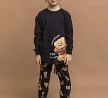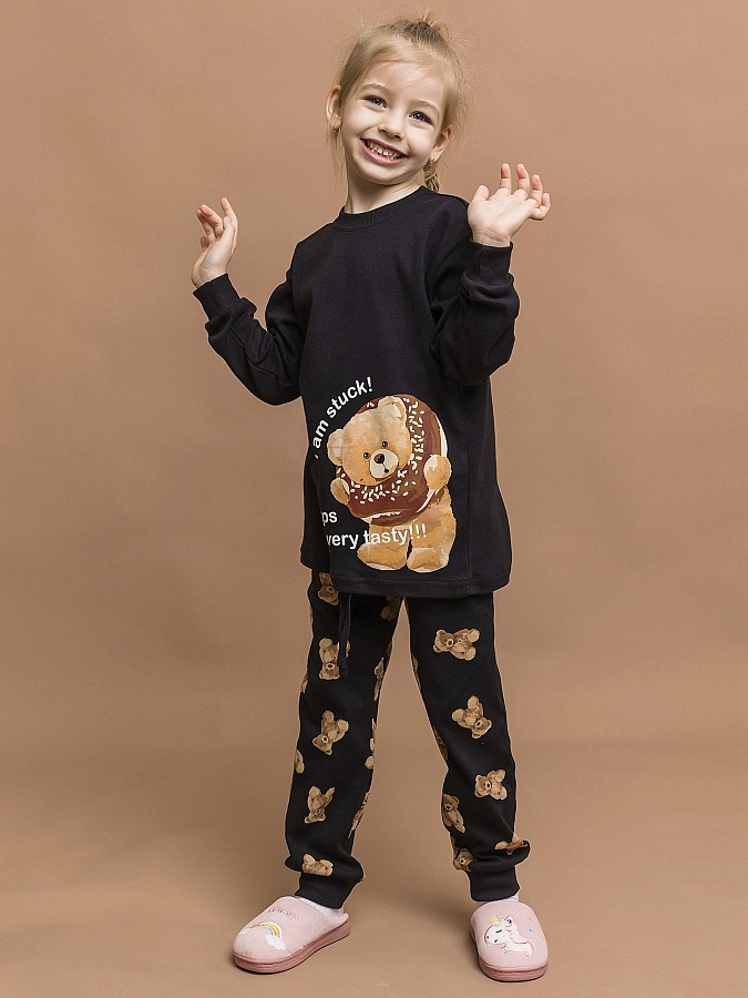 Мягкая трикотажная пижамка для девочек, состоящая из удобной футболки с длинным рукавом и комфортных брюк. Нежный трикотаж – приятный к телу, обеспечивает идеальную свободу движений. Стильный черный цвет – универсальный и практичный. Очаровательный принт с мишками – добавит нотку детской нежности и веселья. Идеальна для сна и отдыха.