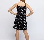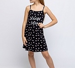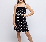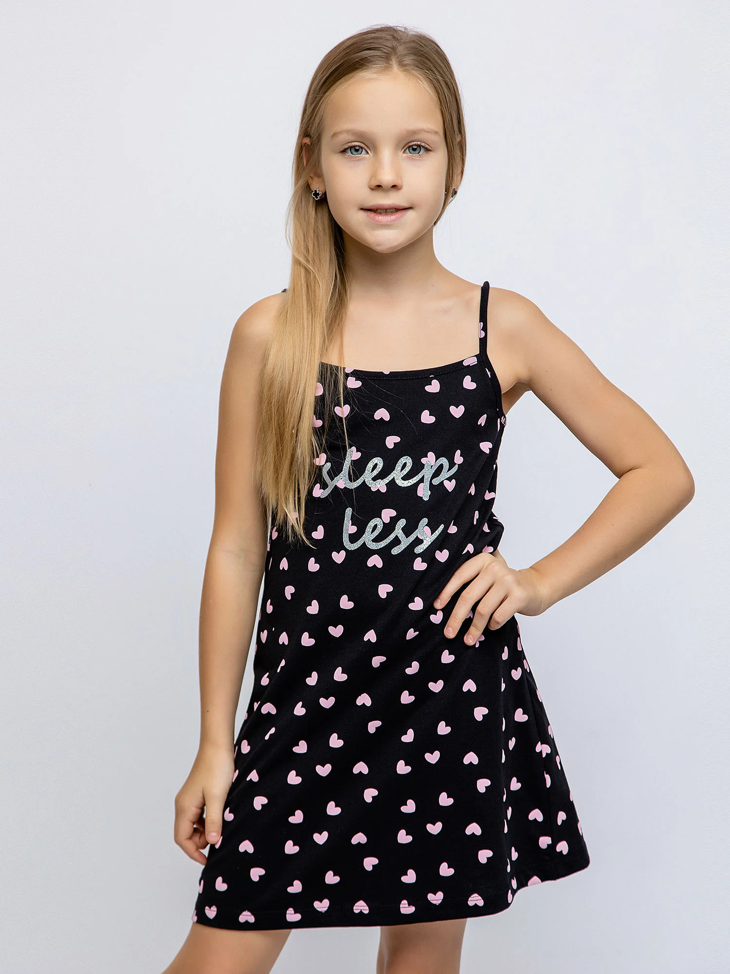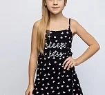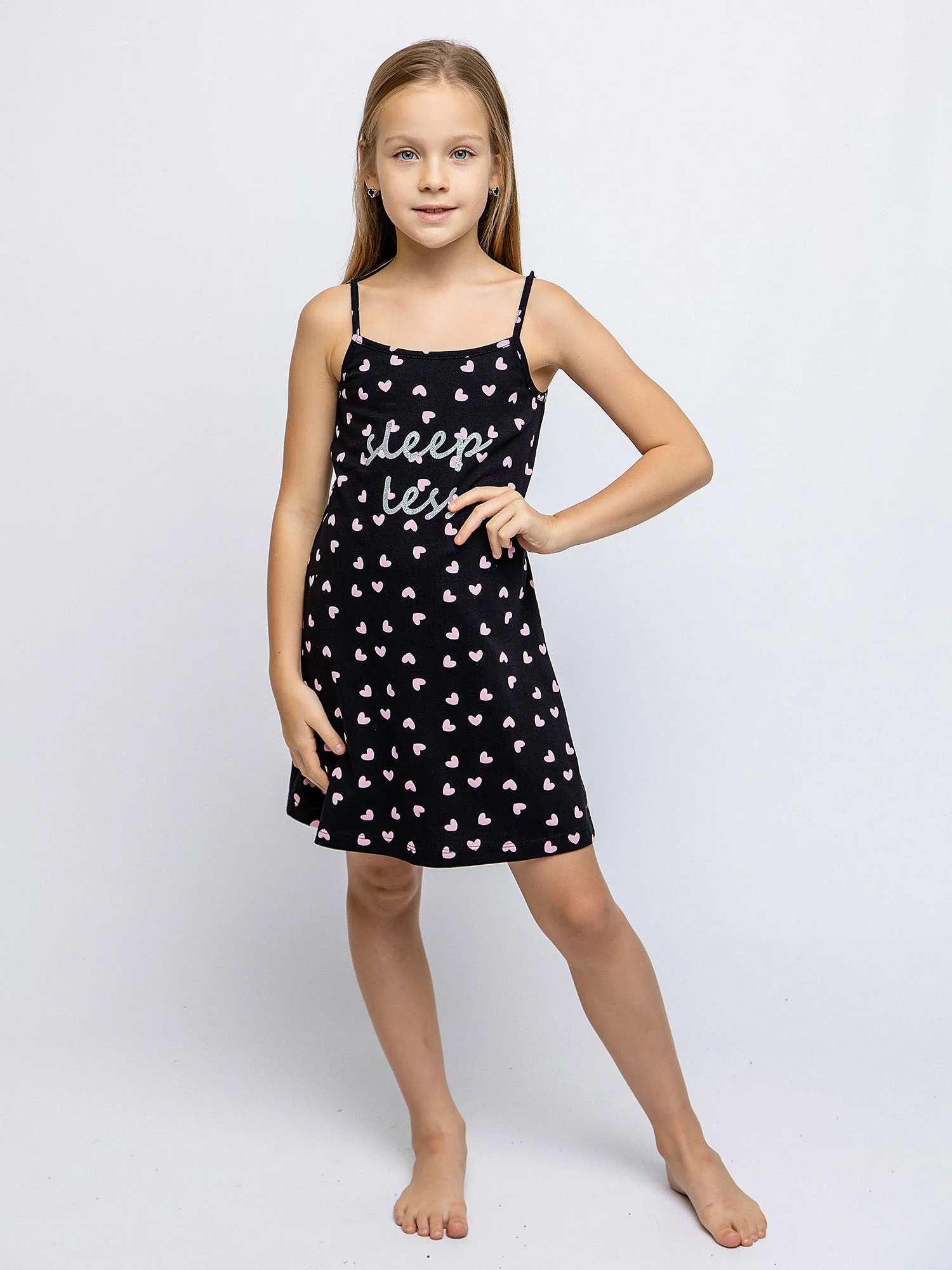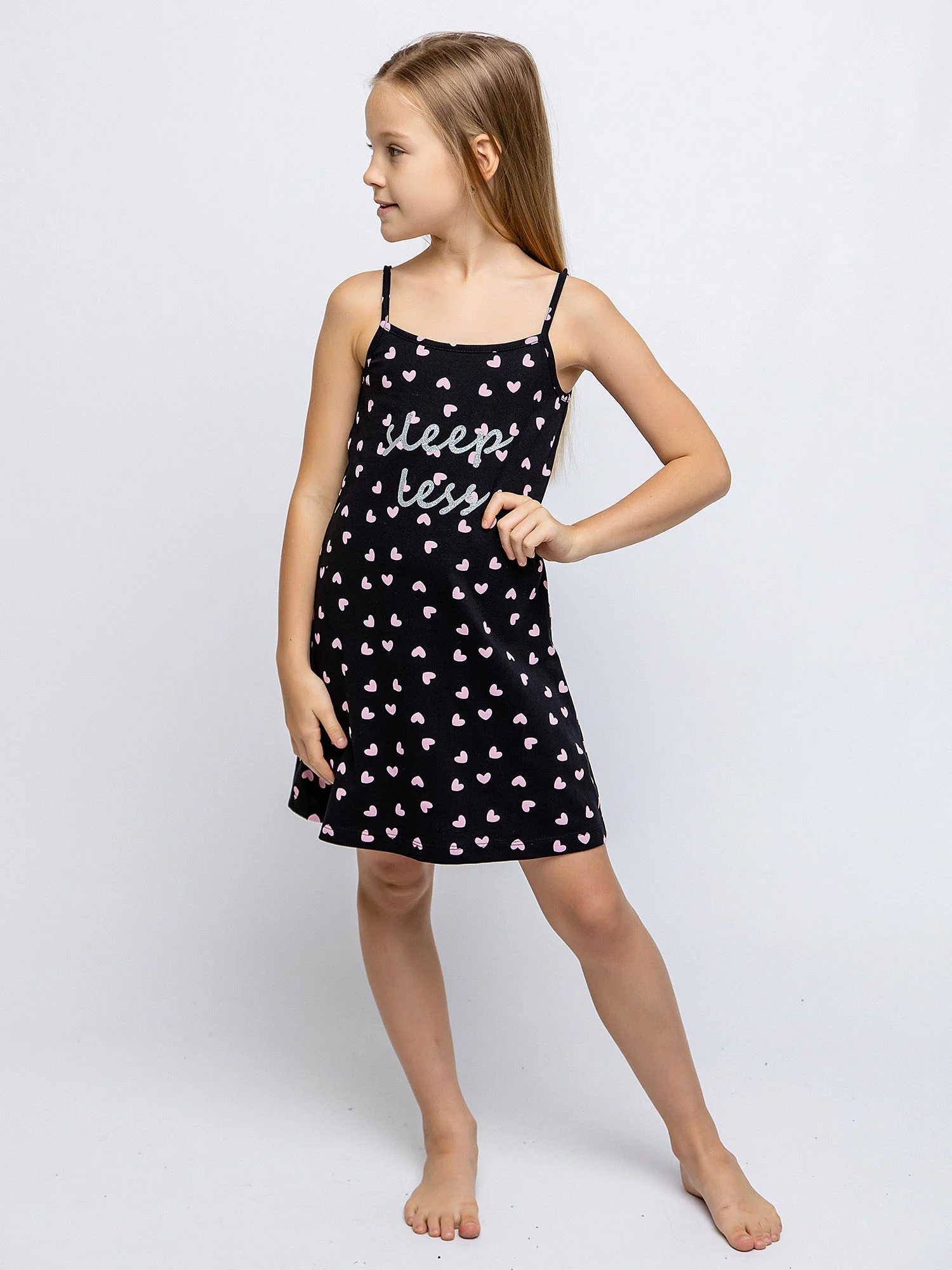 Платье для девочки черное на тонких бретелях из натурального хлопка. Легкое приталенное платье для повседневной носки или сна. Мягкое трикотажное платье для девочки из 100% хлопка - супрем пенье. Принт с розовыми сердечками и блестящая надпись на груди.