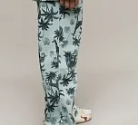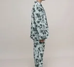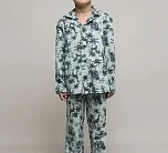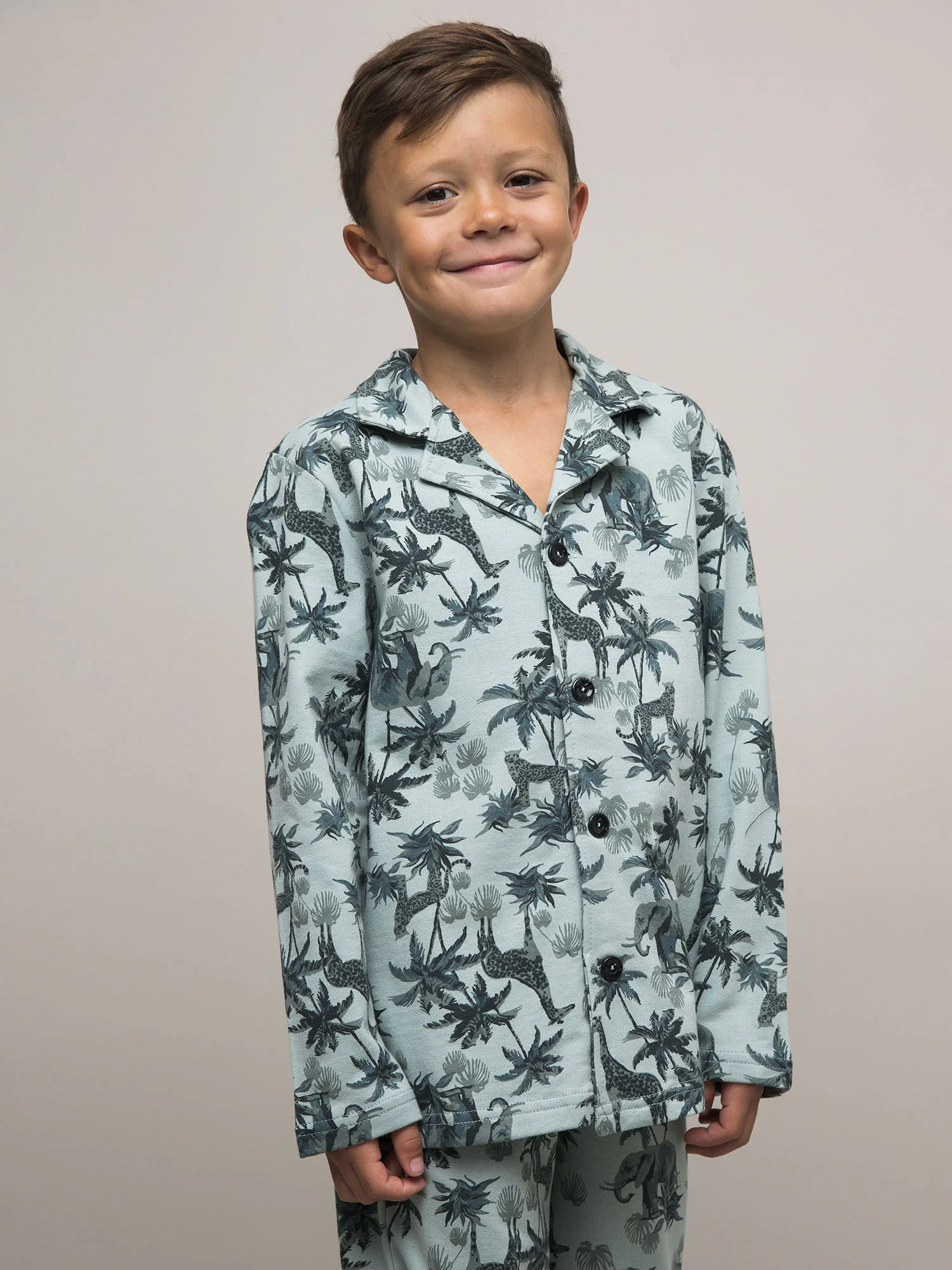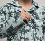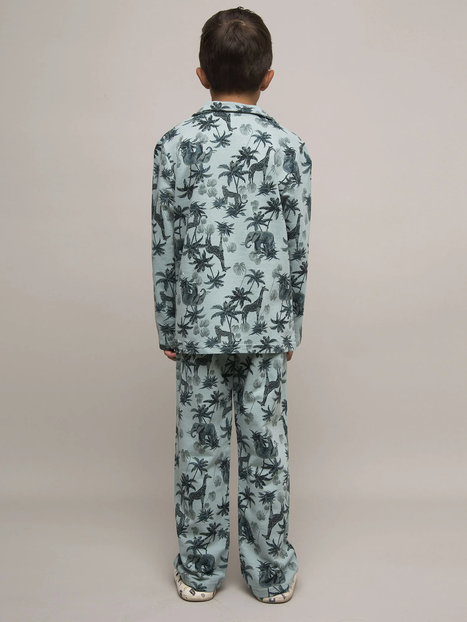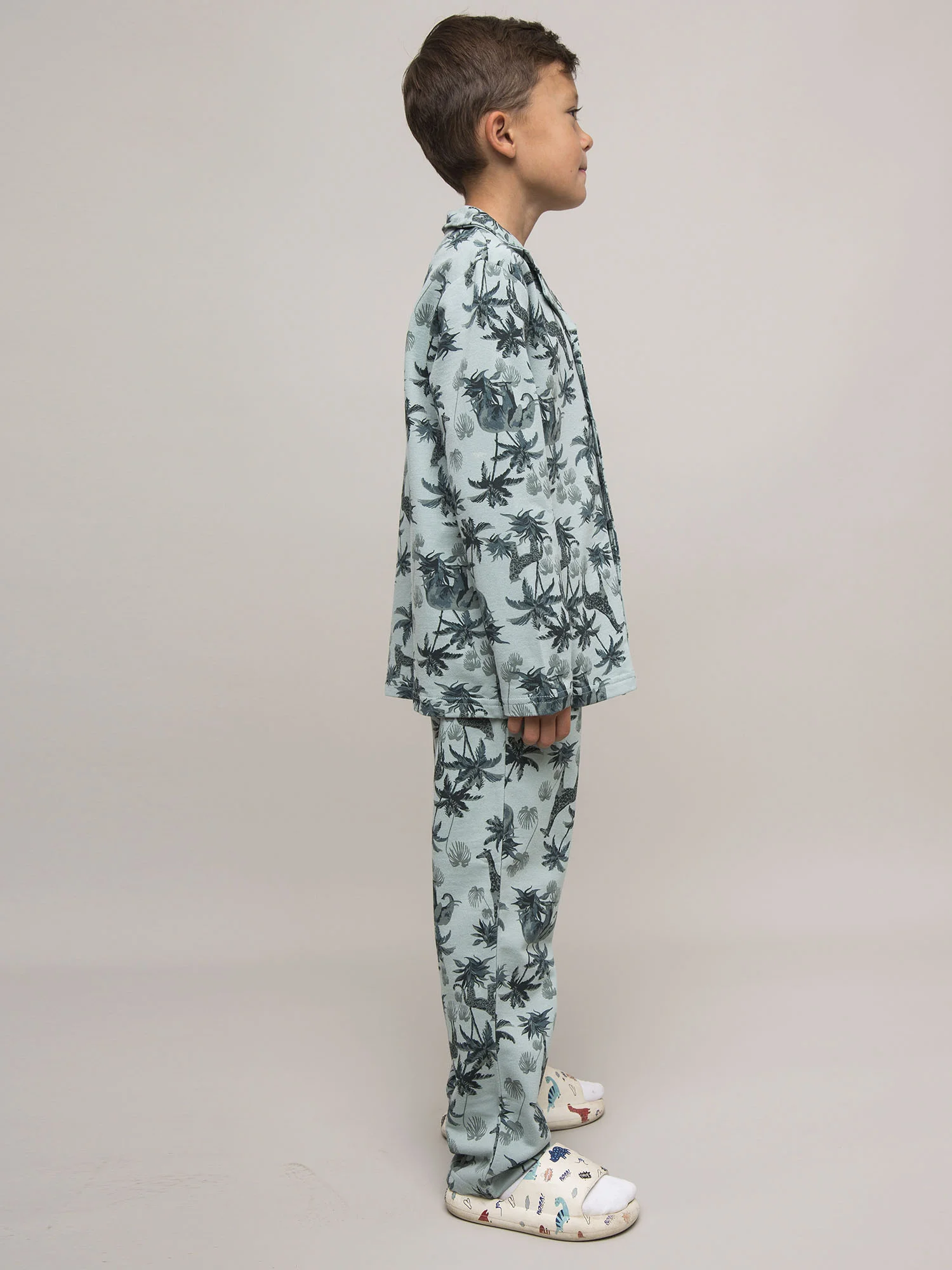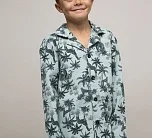 Детский пижамный комплект для мальчика из футера с тропическим принтом. Футболка с длинным рукавом на пуговицах. Брюки свободного кроя на резинке.