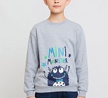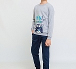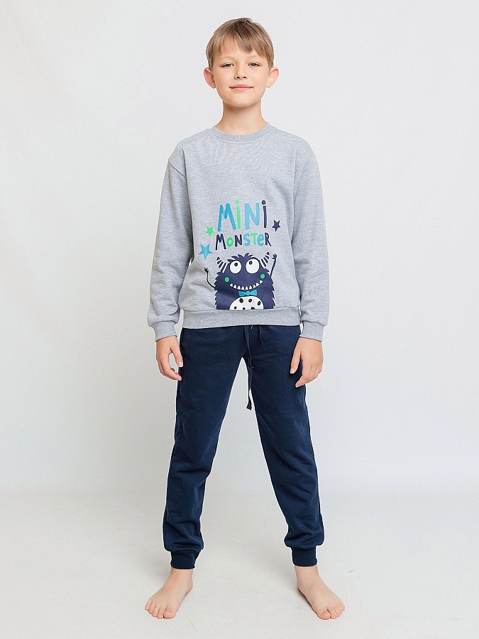 Пижама для мальчика трикотажная из футера с начесом: футболка с длинным рукавом и брюки. Детская пижама сшита из 100% натурального гипоаллергенного хлопка. Пижама подойдет для сна дома и в детском саду, а также можно носить как домашний костюм. Серо-синяя расцветка и принт в виде монстрика на футболке. Брюки с карманами на резинке и завязках.