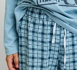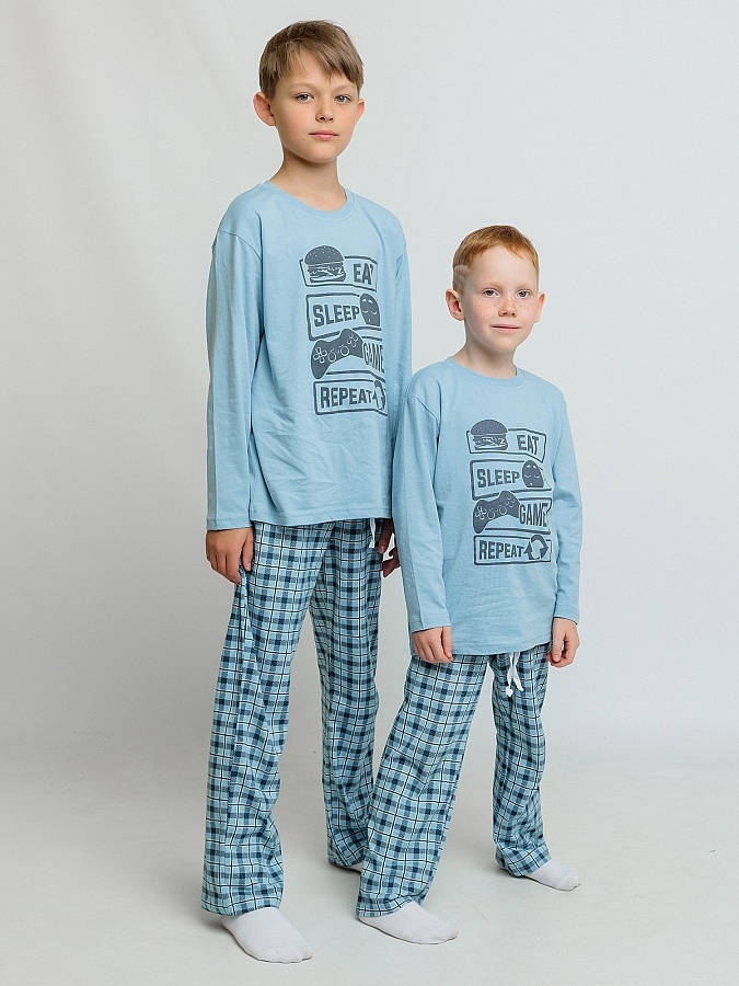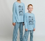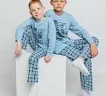 Пижама для мальчика трикотажная: футболка с длинным рукавом и брюки. Качественная гипоаллергенная ткань 100% хлопок, аккуратные швы, стильная расцветка. Футболка голубая с принтом в виде надписей, брюки свободного кроя в клетку.