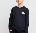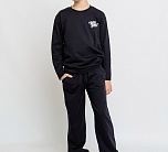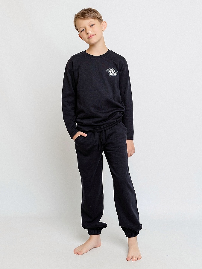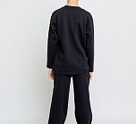 Пижама для мальчика трикотажная из футера с начесом: свитшот с длинным рукавом и брюки. Детская пижама сшита из 100% натурального гипоаллергенного хлопка. Пижама подойдет для сна дома и в детском саду, а также можно носить как домашний костюм. Черная однотонная расцветка. Свитшот с небольшим рисунком. Брюки с карманами и резинкой в поясе.