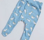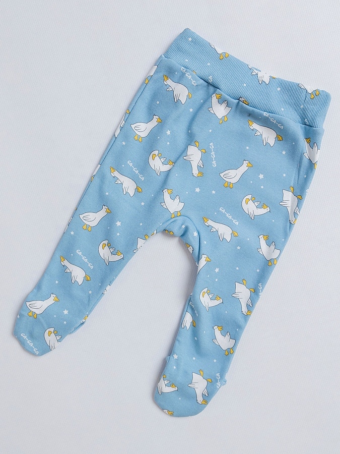 Ползунки для мальчика трикотажные голубые с принтом в виде гусей. Ползунки для новорожденных выполнены из легкой трикотажной ткани, комфортной для младенцев первого года жизни. Мягкая резинка в поясе не будет давить на животик, а благодаря закрытому носочку ножки малыша будут в тепле.